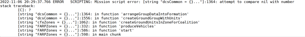 This error is generated when running "demo - base captured.miz" 2022-11-07 14:51:13.738 ERROR SCRIPTING: Mission script error: [string "baseCaptured={}..."]:83: Parameter #2 (delay) missed stack traceback: [C]: ? [C]: in function 'outText' [string "baseCaptured={}..."]:83: in function 'triggerZone' [string "baseCaptured={}..."]:110: in function 'onEvent' [string "Scripts/World/EventHandlers.lua"]:13: in function <[string "Scripts/World/EventHandlers.lua"]:11> -