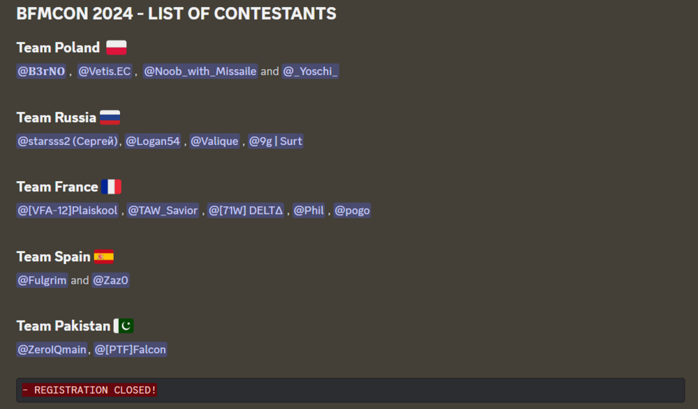 Congratulations to Team France! the first team to win the BFM Cup of Nations! Thanks to all the participating teams, it has been a great event and we shall meet again in the next one! France Winning Roster @[VFA-12]Plaiskool (Team Leader) @[71W] DELTΔ @Phil @pogo