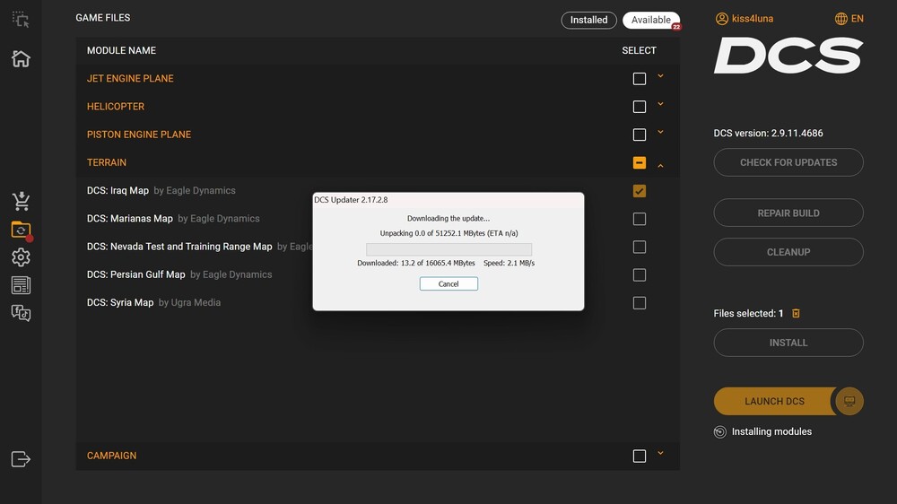 My final stats for this problem: 1. The updater will download the update information very slowly. 2. Download error message both for the updater and DCS UI. 3. Click the install or update button again, if the update information can be downloaded normally then it may be fine. 4. The download could be normal or could be wrong in the middle. This problem is very strange because I now can be sure it's nothing about my PC, my router, my network topology, my OS or software settings. Nothing else I or we can do I think. -