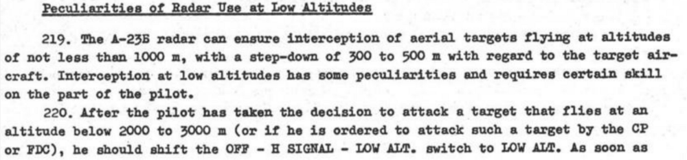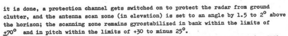 Good find! This helped me find the corresponding section in the english MiG-21 manual: Looks like this is specific to the context of the Low Altitude mode. Is it in the same context in the polish version? The reason why I thought it is stabilized only in the roll axis is this: https://www.mig-21-online.de/mig-21/funkmessvisier/fmv-beschreibung/ translation A similar section is from this document (page 17,18) https://archive.org/details/RP-21_Sapfir_radar_technical_manual/RP-21M -MA technical description/ Bit strange that they emphasize roll stabilization but make no mention of pitch stabilization. Either way, doesn't seem like it 100% clear which way it's supposed to work.