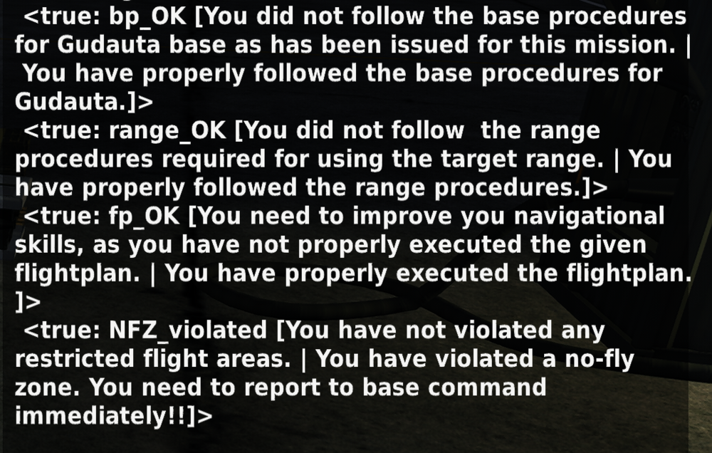 Dear All, in my training mission I want to evaluate the flying performance of the player (in the sense of following procedures). If certain procedures outlined in the mission are met, certain flags are called (i.e. bp_OK, fp_OK and NFZ_violated). At the end I want to give an assessment to the player using the messenger-module. The output comes without taking into account the wildcard-funktionality in brackets, as can be seen in the attached picture. The intention is to output one of the two sentences for any flag, depending on the flag status. I assume, I do not understand the wildcard logic and usage properly. Can anybody hint me to a solution? -