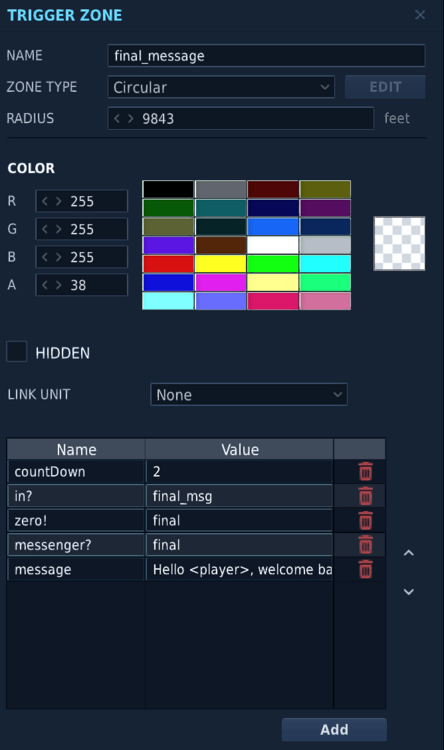 Hello @cfrag, thank you for looking into this. Attached please find a picture of the parameters of the zone utilizing the messenger and the valet zone. I can provide you with the mission file as well, but I do not know, what PM is. -