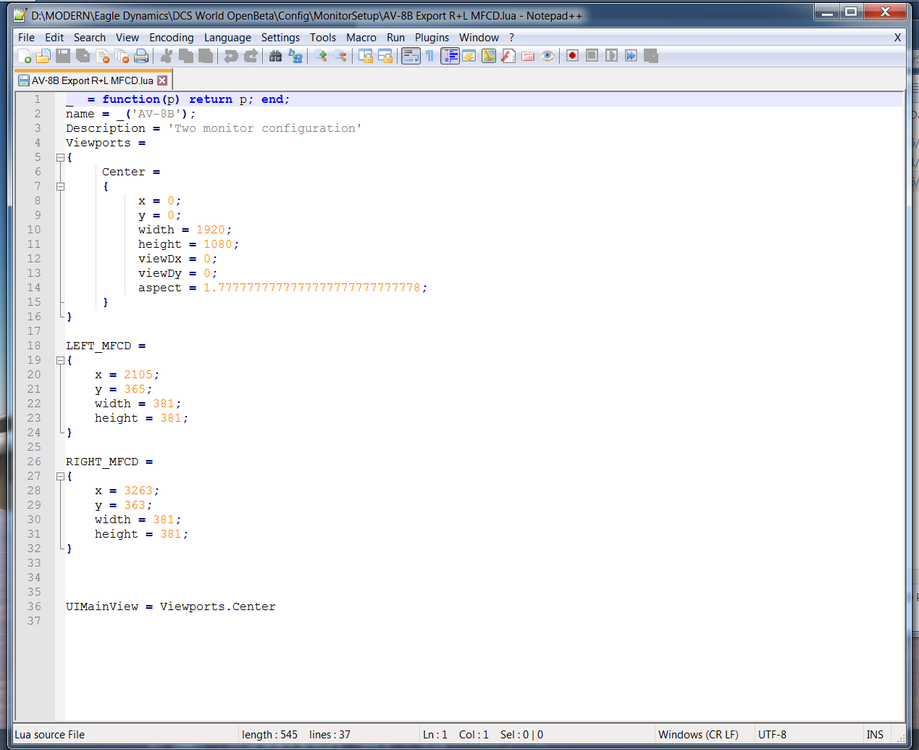 So I've given it a try at exporting the MFD's of the Harrier to a second monitor. I been some what successful getting the MFD's to show up on the second monitor, but I think I have screwed something up in the process. My HUD only displays what you see in picture below and moving map does not work anymore. Below also is the lua file I wrote for it. I'm starting to think it's not the lus file and rather something in the config file itself. I was following someones instructions on how to fix my monitor setup to fix the Gui OK button from not being seen. I don't know if I fix them right or not. Is there files in this location that has to do with HUDs or maps? I've been struggling for two days to get either Helios or Ikarus to work and now I'm screwed. Anybody have an idea. Thanks for the help before hand. I just don't want to have to do a reinstall again. I've tried a repair and it says everything is good to go.