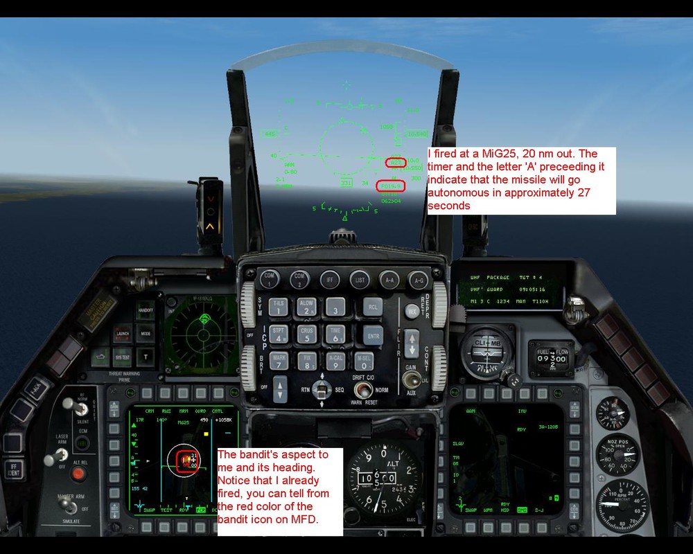 OK, I got a good news and a bad news. Good news is that I just got my first miss on AIM120C, using the same testing method. I dropped the lock and the missile got lost and flew into emptiness. I guess AIM120C in LO isn't totally autonomous after all. Bad news is that I was 25 nm out when I fired. It seems that the seeker on the missile goes active pretty early its flight and it's definitely not when it's just 7~8nm away from the bandit. It seems to go active at much greater distance than that (more like 20nm, judging the distance to the bandit from the MFD on the second screenshot). Anyway, here are the screenies.