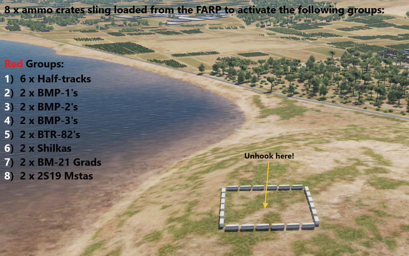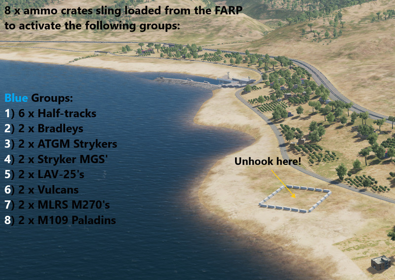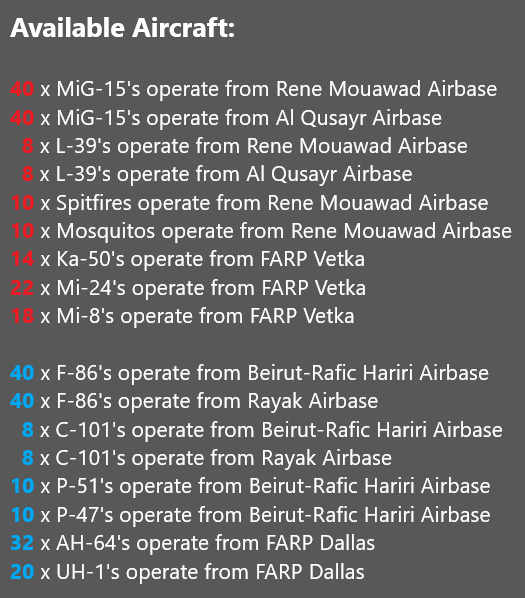 A NEW MISSION HAS ARRIVED!!! Operation: Clash of Eras * The mission runs for 4 hours, unless the objective is completed * What does Clash of Eras mean? - In this mission modules and units from the WWll era all the way to the modern era are featured. - Available modules for Red: MiG-15, L-39, Spitfire, Mosquito, Ka-50, Mi-24, Mi-8 and Combined Arms. - Available modules for Blue: F-86, C-101, P-51, P-47, AH-64, UH-1 and Combined Arms. - All helicopters are visible on the F10 map and not hidden as in other missions. - All types of air-to-air weapons are disabled, even the air-to-air Ataka variant. - No SAM's of whatsoever type anywhere on the map. - All airbases and FARP's are protected by WWll types of AAA's and flak. - Unlike most missions, all airbases and FARP's can be attacked, however, it's not the objective. - Red's main battle tank is the Panzer lV. - Blue's main battle tank is the Sherman. - Red's main AAA amongst the attacking forces is the SPAAA HL with ZU-23 (red truck). - Blue's main AAA amongst the attacking forces is the SPAAA LC with ZU-23 (white truck). - Mi-8's and UH-1's have access to deploying various types of vehicles through CTLD. - In addition, Mi-8's and UH-1's can sling load up to 8 x ammo crates each to rearm (activate) different groups of ground units (see briefing images). ******************************************************************************************* Winning Conditions: - Capture and hold Wujah Al Hajar Airbase, the bullseye area for both coalitions. - Destroy all buildings at the enemy's observation site marked on the map (see briefing images). ******************************************************************************************* Red Objectives: MiG-15's and L-39's: - Top priority objective is maintaining air superiority around the bullseye. - Feel free to perform CAS or strike missions. -------------------------- Spitfires and Mosquitos: - Search and destroy enemy helicopters. - Search and destroy enemy P-51's and P-47's. - Feel free to perform CAS or strike missions. -------------------------- Ka-50's and Mi-24's: - Provide CAS around the bullseye. - Attack the enemy's observation site. Waypoints / ABRIS Waypoints: WP-1 - Wujah Al Hajar Airbase, bullseye. Neutral at mission's start WP-2 - Position of the enemy ground units at mission's start WP-3 - Position of the enemy observation site -------------------------- Mi-8's: - Deploy whatever crates are needed. 42 crates max (using CTLD). - Sling load a total of 8 x ammo crates to reload (activate) various ground groups. - The ammo crates are right next to the FARP, due north. - The zone for unhooking crates is ca. 10 km due west by the coast (marked on the F10 map). Mi-8's -> Picking up crates (CTLD): Bring up your radio menu, select F10 for CTLD and then whatever type of crates you want to pick up. *** You can only pick up one crate at a time *** For picking up a crate, maintain hover over it for 5 seconds while keeping an altitude of at least 7.5 meters and a maximum altitude of 15 meters. To unpack a crate, make sure you're at least 5 km away from the FARP. Blue Objectives: F-86's and C-101's: - Top priority objective is maintaining air superiority around the bullseye. - Feel free to perform CAS or strike missions. -------------------------- P-51's and P-47's: - Search and destroy enemy helicopters. - Search and destroy enemy Spitfires and Mosquitos. - Feel free to perform CAS or strike missions. -------------------------- AH-64's: - Provide CAS around the bullseye. - Attack the enemy's observation site. Waypoints: WP-1 - Wujah Al Hajar Airbase, bullseye. Neutral at mission's start WP-2 - Position of the enemy ground units at mission's start WP-3 - Position of the enemy observation site -------------------------- UH-1's: - Deploy whatever crates are needed. 42 crates max (using CTLD). - Sling load a total of 8 x ammo crates to reload (activate) various ground groups. - The ammo crates are right next to the FARP, due north. - The zone for unhooking crates is ca. 6 miles due west by the coast (marked on the F10 map). UH-1's -> Picking up crates (CTLD): Bring up your radio menu, select F10 for CTLD and then whatever type of crates you want to pick up. *** You can only pick up one crate at a time *** For picking up a crate, maintain hover over it for 5 seconds, while keeping an altitude of at least 25 feet and a maximum altitude of 50 feet. To unpack a crate, make sure you're at least 3 miles away from the FARP.