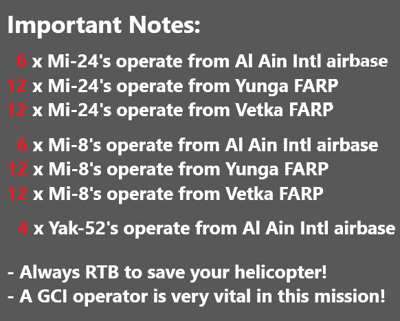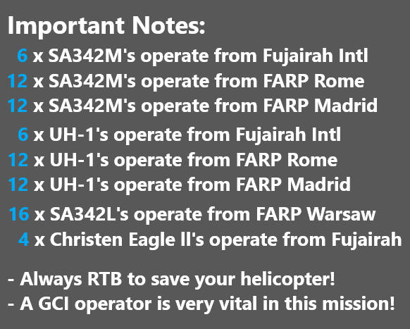 Operation: Close Air Support Situation: - The mission focuses on helicopters and the Combined Arms module ONLY. Fast movers are excluded! - Therefore, it will not be part of the daily missions, but rather put online occasionally. - Featured map: Persian Gulf. Red operates from Al Ain Intl Airbase, a western and an eastern FARP. Blue operates from Fujairah Intl Airbase, a western and an eastern FARP. *** The mission runs for 6 hours, unless the objective is completed *** The objective is to capture all 3 airbases of the enemy by either moving in ground units or deploying troops. Mi-8's and UH-1's can transport only troops. Use whatever ground vehicles available sensibly and have Mi-24's/SA342's provide CAS. Combined Arms or GCI operators are vital in this mission. Players might want to do it for a while and swap slots with helicopter pilots for a change. Up to the players. * Note that the additional and third Blue FARP, Warsaw, is NOT part of the objective. It's only there for SA342L's to operate from * Red Objectives: Important Notes: All helicopters are limited in numbers! Basically, you can land your helicopter at Al Ain Intl Airbase or one of our two FARP's to save it. However, it's preferred to RTB to the airbase/FARP you started at to avoid transferring all or most helicopters to one airbase/FARP. Helicopters landing at Al Ain Intl Airbase must land within 1 km from the airbase to save the helicopter. Each FARP has 4 single helipads. 2 for Mi-24's and 2 for Mi-8's. Check out the briefing images to know what single helipads are suited for your type of helicopter to land at in order to save the helicopter. If you land and leave (exit the slot) the helicopter at the wrong helipad, the helicopter is indeed saved, but players will have no access to it, because there's no slot to choose for that type of helicopter at that certain helipad. * This is a limitation in the game we have to deal with * ******************************************************************************************************* - Each FARP (friendly and foe) has 2 x AAA emplacements, a few MBT's, APC's and scout vehicles around it. - The T-72B is our MBT. The enemy's is the Merkava IV. - BTR-80's are our APC's. M-113's are the enemy's. - BRDM-2's are our scout cars. The enemy's are Humvees. - The only IR SAM threats are UH-1 deployed MANAPD's. Only 2 x Chaparrals at the enemy's airbase, Fujairah Intl. - 1 x Hawk SAM site at Fujairah Intl Airbase. - UH-1's can deploy troops only, so no additional SAM units or AAA's for the enemy. ******************************************************************************************************* Mi-24's: Waypoint-1 is the enemy's western FARP Waypoint-2 is the enemy's eastern FARP Waypoint-3 is the enemy's airbase, Fujairah Intl Search & Destroy enemy ground units! It's preferred to have the GCI operator scout a specific area using his ground units, before you go in there not knowing what might await you. * Note that the enemy has 1 x Hawk SAM site and 2 x Chaparrals at Fujairah Intl Airbase. The latter is mobile! * ----------------------------------------------------------------------------------------------------------------------------------------------------------- Mi-8's: Waypoint-1 is the enemy's western FARP Waypoint-2 is the enemy's eastern FARP Waypoint-3 is the enemy's airbase, Fujairah Intl Deploy troops at areas where they can intercept enemy ground units or helicopters. In addition, you can deploy troops at the enemy's FARP's or airbase to capture them. The assault troop consists of 1 x AK-47, 2 x MG's, 2 x RPG's and 1 x MANPAD. ----------------------------------------------------------------------------------------------------------------------------------------------------------- Yak-52's: You objective is to provide reconnaissance for your GCI operator. Maintain a high altitude while doing so to avoid being shot down by MANPAD's and AAA's. ----------------------------------------------------------------------------------------------------------------------------------------------------------- Combined Arms: The 2 cmdr slots are for players controlling ground units while being on SRS with each other and other players to coordinate their attacks. You MUST be on SRS as a cmdr operator! The JTAC slots are mainly for players who want to check out the situation quickly, provide GCI for a group of people or preferably everyone. In addition, you can use the JTAC slot to drive a ground unit. However, the latter requires you being on comms with cmdr operators to avoid confusion and/or causing problems to their attacks. ----------------------------------------------------------------------------------------------------------------------------------------------------------- Frequencies: * EWR's are NOT available! GCI/Team's main comms: 124 MHz - Channel 0 for Mi-24's on the R-863 radio system Jadro (for comms amongst helicopters only): 03550.0 kHz Al Ain Intl Airbase: 119.85 MHz FARP Vetka: 127.5 MHz FARP Yunga: 129.5 MHz *********************************************************************************************************************************************** Blue Objectives: Important Notes: All helicopters are limited in numbers! Basically, you can land your helicopter at Fujairah Intl Airbase or one of our two FARP's to save it. However, it's preferred to RTB to the airbase/FARP you started at to avoid transferring all or most helicopters to one airbase/FARP. Helicopters landing at Fujairah Intl Airbase must land within 1 mile from the airbase to save the helicopter. Each FARP has 4 single helipads. 2 for SA342M's and 2 for UH-1's. Check out the briefing images to know what single helipads are suited for your type of helicopter to land at in order to save the helicopter. If you land and leave (exit the slot) the helicopter at the wrong helipad, the helicopter is indeed saved, but players will have no access to it, because there no slot to choose for that type of helicopter