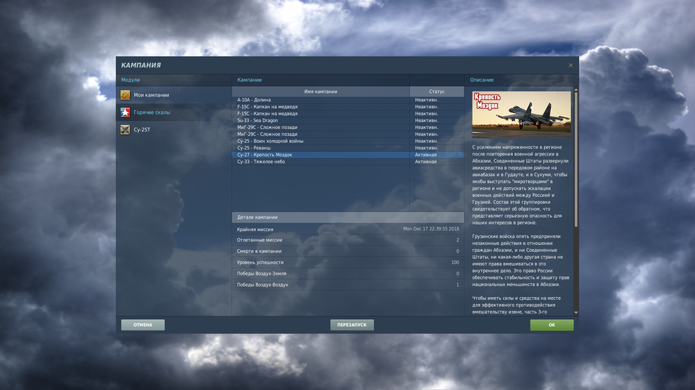 Парни , ещё пара вопрсов по теме : Во первых - в чистой dcs , что, только одна комрания? можно-ли откуда скачать доп.компании, или для этого надо покупать модули (гс2 илигс3)? И ещё - при прохождении миссии в компании со 100 процентным результатом не перебрасывает автоматом на следующую миссию,это нормально? Т.е. приходится нажимать выход, после жать далее. И вот такой вопрос - при посадке на филд диспетчер дает команду заруливать на стоянку, как правильно определить место стоянки ? Обычно на филде их минимум 2 ( не считая ангаров).