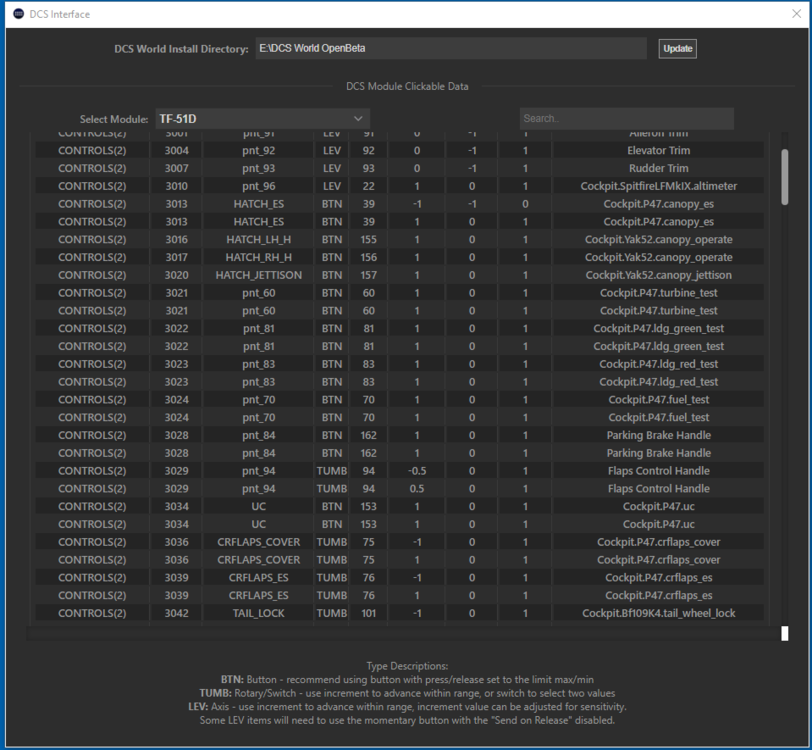 P-47D ID Lookup I made a simple 3 item export file for P-47 to use for testing,and when checking it with DCS comms, the values will change. That part is good. But the ID Lookup shows nothing. Now for the weird part. Thinking maybe that the DCS plugin didn't like the double "-" as in P-47D-30, I renamed the Dir to P-47D,.nope that didn't work. So on a whim I made a backup copy of my TF-51D Dir, coped all the P-47D-30 stuff to the TF-51 and I'll be .. ID lookup showed all the P-47 items. Of course I can't fly it this way, so I put everything back the way it was supposed to be. My question is how do I get the plugin to recognize the P-47D-30, without all the tricks ? Thanks
