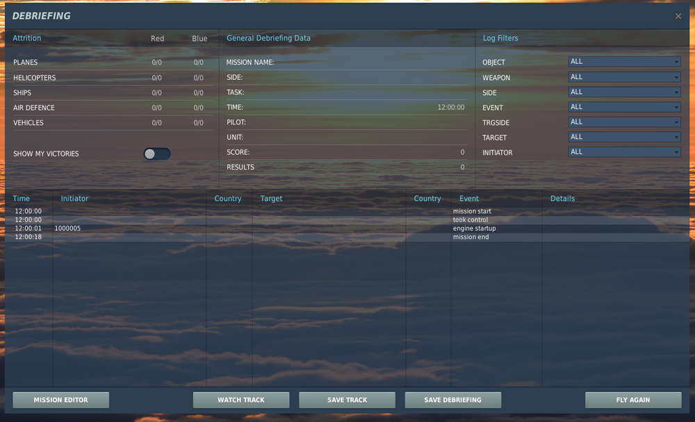 7. Yes certainly you looked at the wrong file... Mine is just the 'group to spawn' table and the DCS Scripting function addgroup. No more script to be sure it's a DCS problem not a script Framework problem. In my point of view if initiator is not well initialized (name and nation) in debriefing window, simply using DCS Scripting functions wrapper, it's an issue. It's not a big problem of course and not a priority for sure, but I hope that this issue will be fixed one day ;)