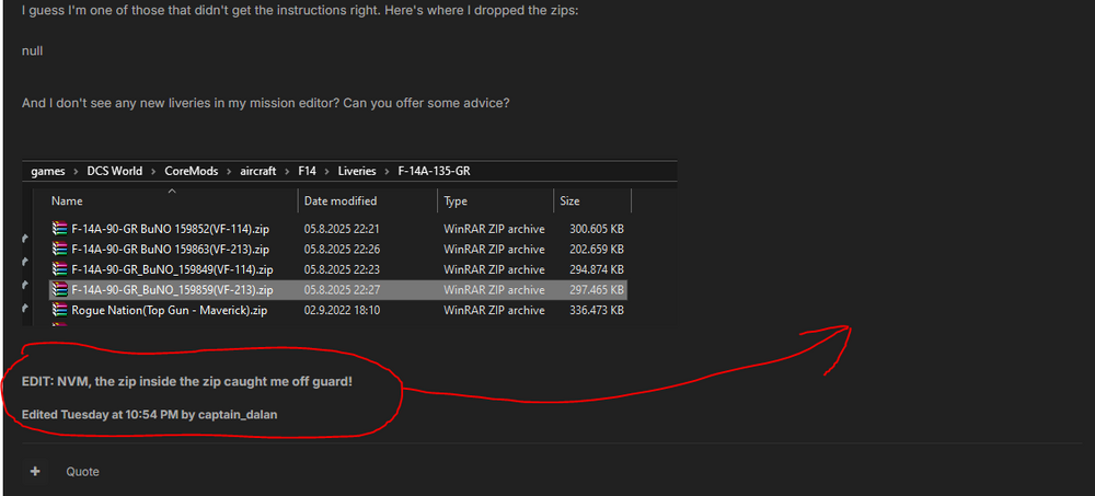 I guess I'm one of those that didn't get the instructions right. Here's where I dropped the zips: null And I don't see any new liveries in my mission editor? Can you offer some advice? EDIT: NVM, the zip inside the zip caught me off guard! -
