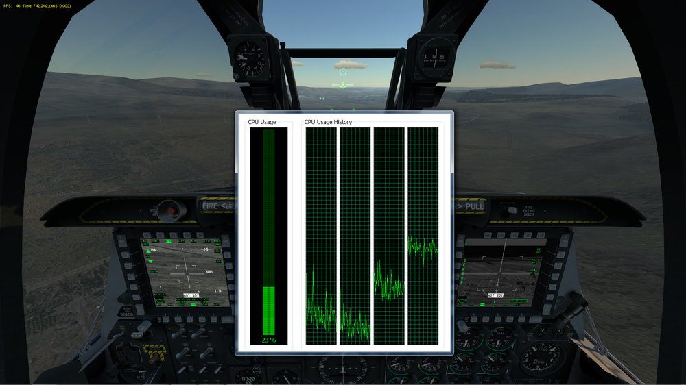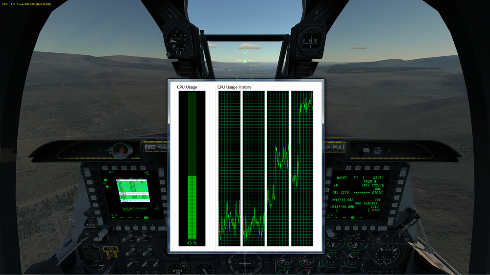 19. I just noticed a curious fact, maybe it will give a clue to the devs at what's going on. When the MAV and TGP pages are up on the MFDs, the CPU utilization goes DOWN! And so does the FPS... I select some text pages, and the usage, and FPS go back up. Why?? The game is in active pause, nothing else changes. Please try on your PC.