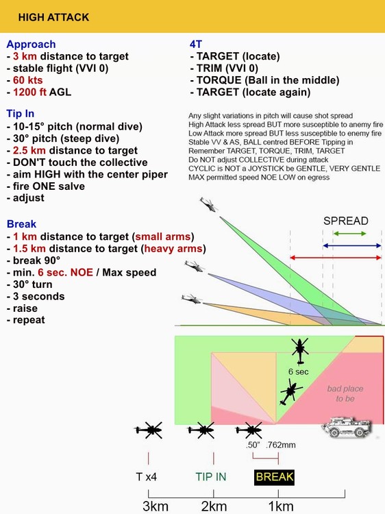 Thanks for your input. I also tried that and like you said, rockets "would" be the way to go, but it seems so difficult to destroy the BMP with a high-level attack. Very often it seemed like my first salve hit the target but it obviously didn't destroy the BMP. The problems with the guns is that you really have to go close (too close). In theory, you should break at least 1.5km before the target (heavy arms) or 1 km (small arms). Of course it's theory, but self-preservation really should be number one goal. Yeah, I know, I also overflew the target in my video.... Do you give the wingman commands to also attack AA? IMO an option is to give him the pincer right or left command before giving him the attack command. I'm pretty sure doing it with a human 2-ship would be interesting. I'm using this kneeboard as a reference for my high-level attack (created/summarized out of 3 pages to make it fit on one kneeboard page). Anyway, I may also try your strategy.