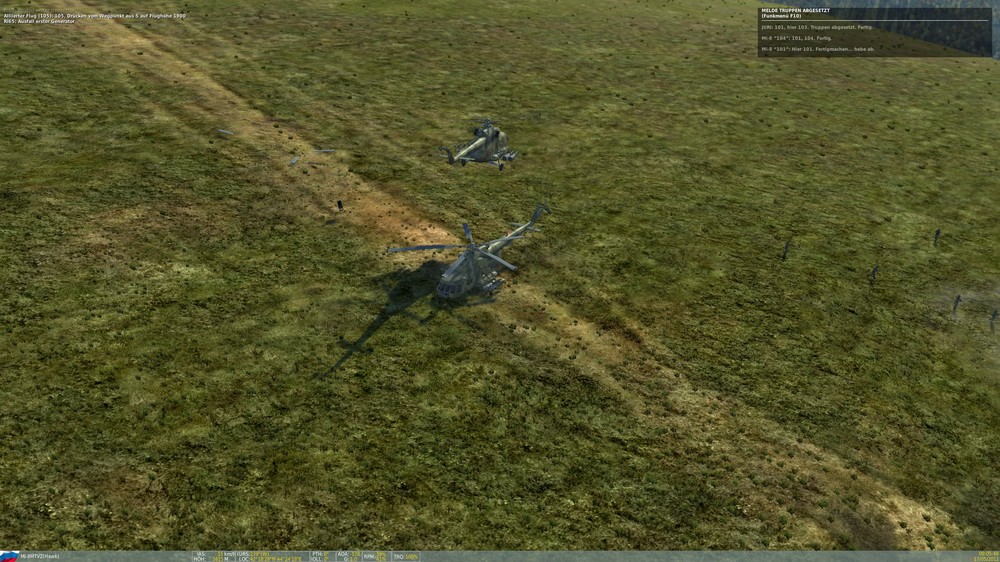 There's another thread about that, so maybe you'll find some valuable input there. https://forums.eagle.ru/showthread.php?t=134659 Personally, I think the speed isn't the problem because the AI often "brakes" before they ascend to get over the hill. So it doesn't matter when you're slightly behind them. The even worse problem - and I count this as "bug" now... the AI tends to land on my chopper. This happened 3 times so far. Twice on LZ3 and once on LZ4 (see screenshot - I slightly pressed too late when he was already airborne. But he destroyed my blades). So where shall I land to avoid this? No matter where I land...the wingman simply seems to crash into me. And in my last attempt, when I landed a bit further away on LZ3, the troops who were disembarked, managed to damage my Mi-8. It's just getting very frustrating to do the formation flight over and over again to finally fail due to the AI wingman. I wish this guy would still stay there ;-) So he wouldn't get into my way.