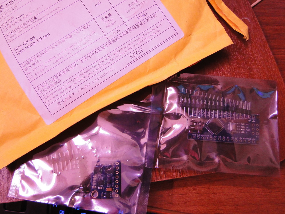 1. http://ru.aliexpress.com/item/GY-85-BMP085-Sensor-Modules-9-Axis-Sensor-Module-ITG3205-ADXL345-HMC5883L-6DOF-9DOF-IMU-Sensor/2024503421.html датчик и вот у него же ардуинка http://ru.aliexpress.com/item/4PCS-2pcsATmega328-Mini-USB-Board-2pcs-USB-Cable-Nano-3-0-Atmel-ATmega328/1990724032.html брал именно у него.