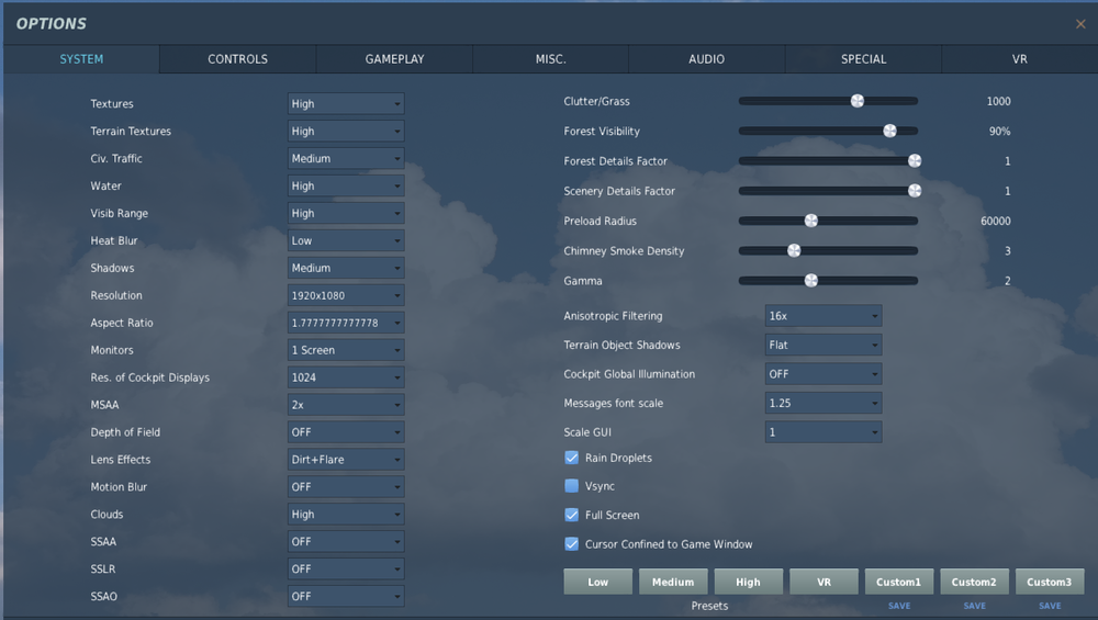 Glad to know the 119.xxx is the same as 120 and not indicative of an issue. I'll work to lower a few settings to help it stay above 60fps. Whats strange to me is before I started using this new monitor, I never had fps issues or stutter. It almost always was above 60fps. They're both HD (1920-1080) and the only difference is the Freesync/Gsync and 120 Hz (DP) vs 60 Hz (HDMI). I've tried using HDMI (and losing Gync capability) but there's no change in the stutters in DCS. Vsync behavior is also confusing to me. As I said, Gsync does no give the "GSYNC" green flag in DCS, so I assume it's not working. But if I turn off Gsync Capability in NCP, or set Maximum Refresh to Fixed Refresh, I dont see much different except I get screen tearing. So it must be doing something? If I then turn on Vsync in NCP or in-sim, I get way worse stutters and low FPS. Here are my current settings. Is there anything that stands out as an issue?