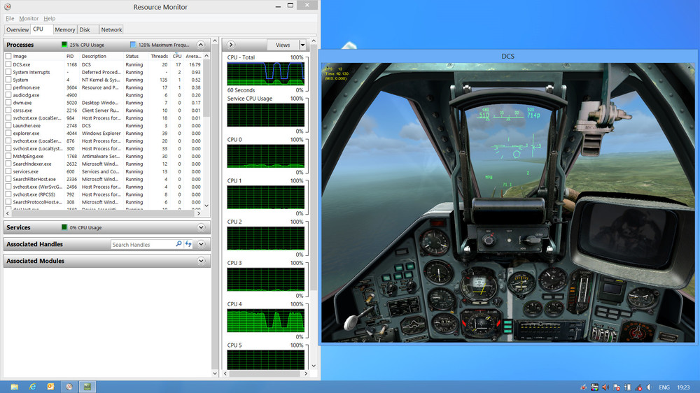 Ok, indexing & windows local account made no difference. I ran DCS windowed alongside the resource manager. The peaks and troughs coincide with the stutters I'm experiencing. They happen more frequently in windowed mode but to the same scale (ie dropping to similar fps for a few seconds). Ideas anyone? -