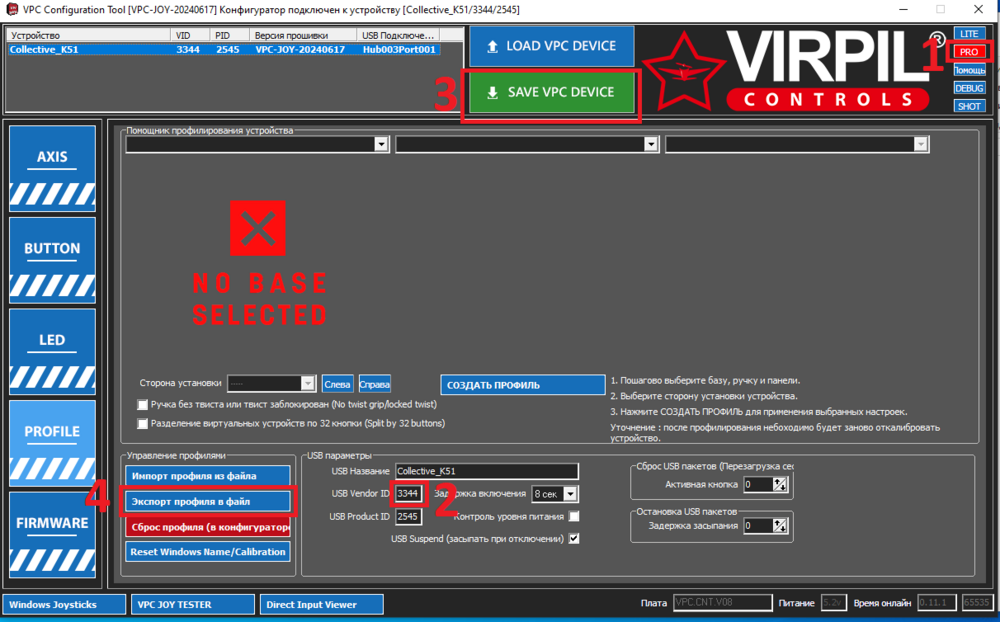 Important message For those who use my devices on the VPC controller (DIY.ATMEGA.V01) and want to upgrade to a more recent version of the VPC Software Setup Version. For this to go smoothly, you need to take several steps. 1. In the version of the program you are using, enable the "PRO" mode. 2. Go to the "PROFILE" tab and edit the "USB Vendor ID" address and change it to 3344. 3. Write the correction to the controller by clicking "SAVE VPC DEVICE" 4. Make a backup copy of your profile by saving it in the folder you need by clicking export profile to file. 5. Now close the VPC program and delete it using the application uninstaller in Windows (I recommend deleting it rather than installing a new one on top). 6. Install the new version of the program, click "PRO", go to the "FIRMAWERE" tab and install the new controller firmware. 7. After installing the controller firmware, it should reboot several times and automatically go to the “PROFILE” tab. Click Import profile from file, find a copy of your profile, select it and click “Open”. Be sure to check that the USB Vendor ID is registered as 3344. It is very important!!!!! 8. Write the profile to the “SAVE VPC DEVICE” controller. In case you have already tried to update yourself, but it didn’t work out and the device is no longer visible to the VPC program. Let's do the following. 1. Uninstall the new version of the program and install the current version or version 20230328. 2. If Windows no longer sees the device or sees it with an error, reboot the computer with the USB pulled out from the device. On the controller board we find two contacts labeled “BOOT”, close these contacts and connect the USB to the computer, having previously launched the VPC program. 3. The VPC program should see a controller called VPC "Bootloader" and will offer to update the controller firmware. Let's do it. 4. After flashing the controller, install the device profile from the saved folder or download it here. 5. Follow steps 1-8 described above. Profiles 2_0617 for Collective with 3 axes. _K51 for Collective with 2 axes. Collective_2_0617.XMLCollective_K51.xml If you have any questions, write in a personal message.