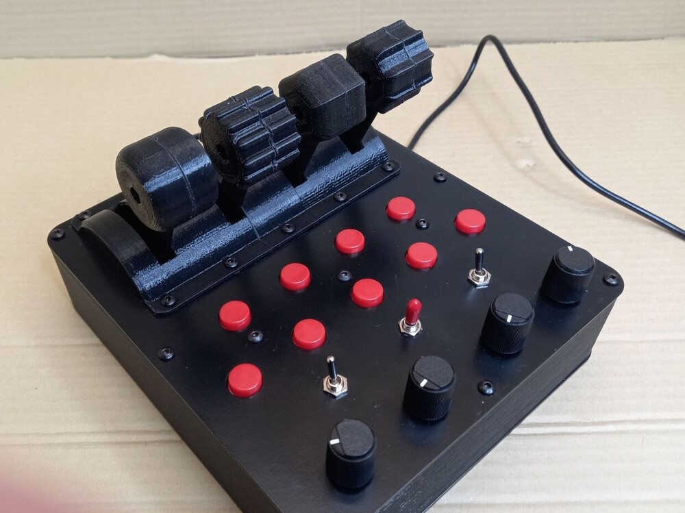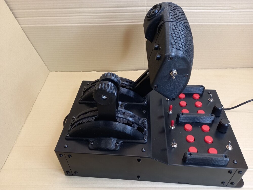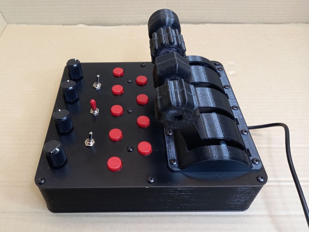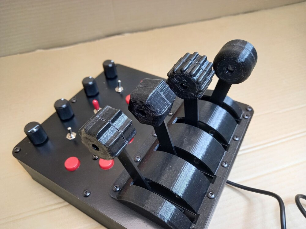 Панель. 8 осей (4 с рычагами на TLE, 4 на резисторах), 9 тактовых кнопок, три тумблера. Контроллер Ардуино, программа MMJoy2. На дне отверстия для крепления с резьбой М5. В комплекте крепления к кронштейну с возможностью регулировки по высоте и углу наклона. Для удобства использования предусмотрена возможность изменить положения выхода USB кабеля (верхняя или нижняя стенка). Материал метал и пластик 3Dпечать. Цена 7 000 + доставка. -