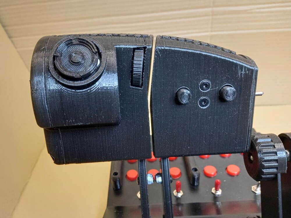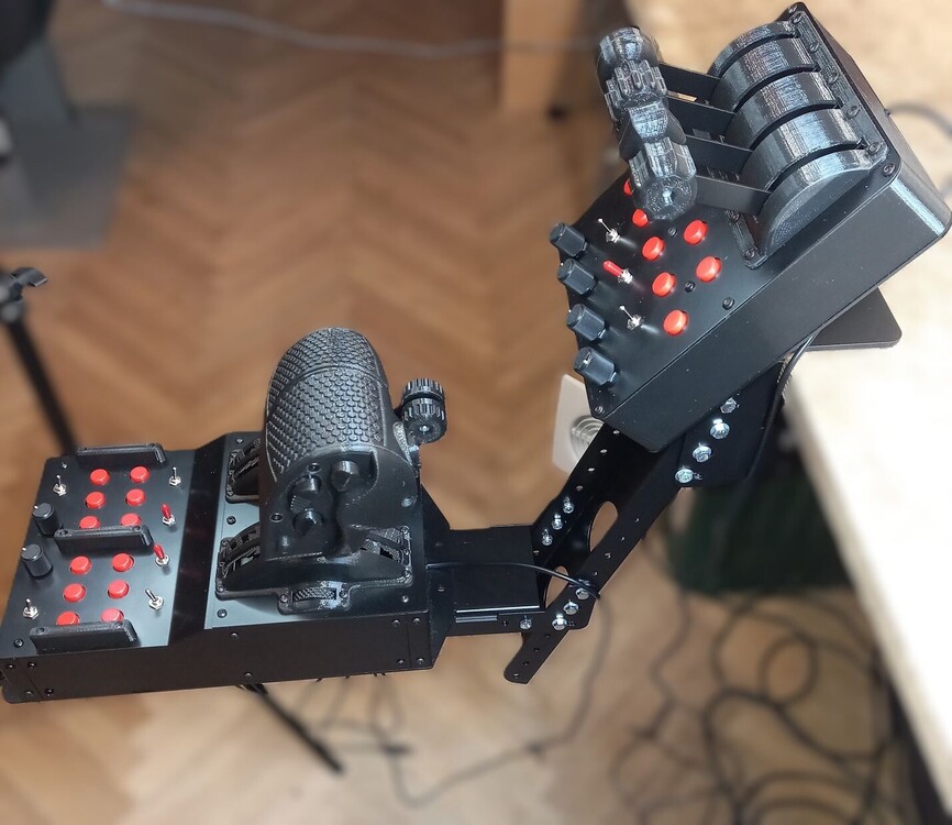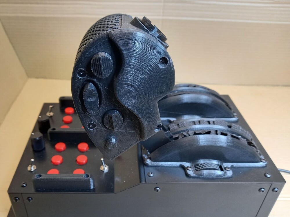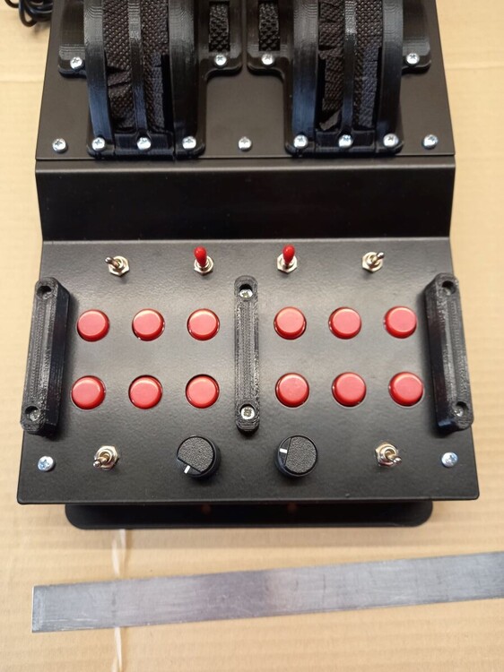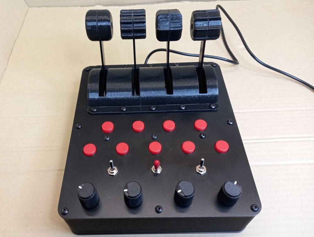 Панель. 8 осей (4 с рычагами на TLE, 4 на резисторах), 9 тактовых кнопок, три тумблера. Контроллер Ардуино, программа MMJoy2. На дне отверстия для крепления с резьбой М5. В комплекте крепления к кронштейну с возможностью регулировки по высоте и углу наклона. Для удобства использования предусмотрена возможность изменить положения выхода USB кабеля (верхняя или нижняя стенка). Материал метал и пластик 3Dпечать. Цена 7 000 + доставка. -