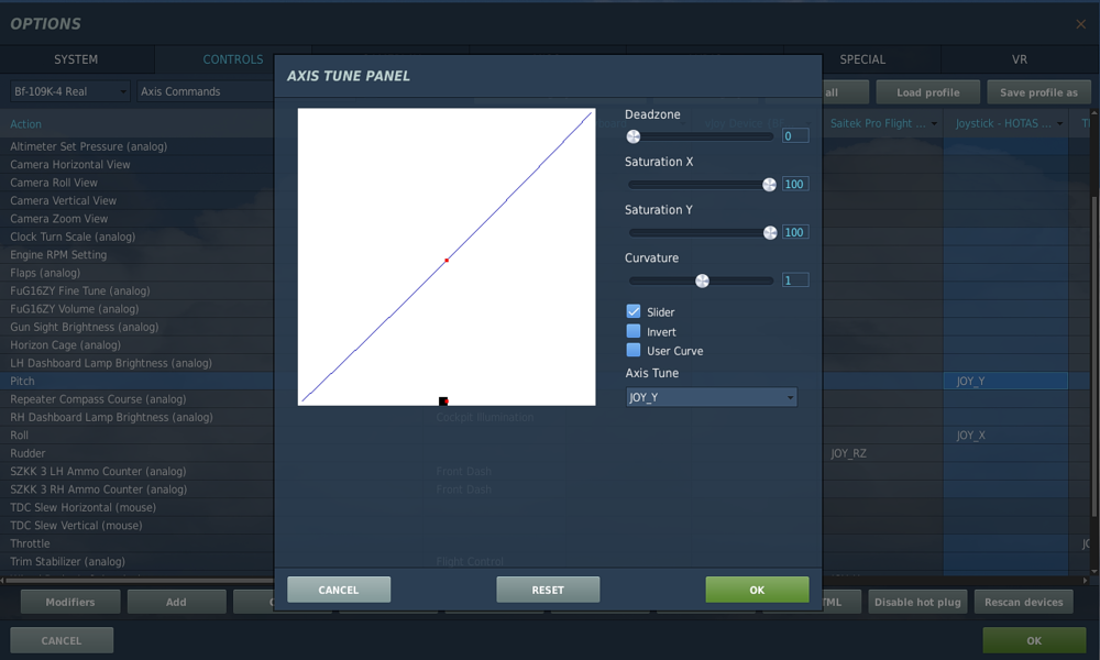 Due to the endless discusion about the elevator Trim i decided to share my privat Trim fix for the BF109K4. Simple set the pitch tune to slider and push the curve forward by 1, this will hold the stick in place a bit forward. Simulates a Trim Tab to get more range for the trim wheel. My Role and Rudder setings are adjusted for a level cruse around 525kph and WEP. I got a Warthog with a sticky center, holds in place in a range around 1-2mm, so i can do fine adjustements during the flight. If you got a perfect centered stick, i dont know if the setting works for you, but you can play around with the special setting to fit your needs. Hope that helps and relives the pain of the Nose Trim cheers Pictures of my settings below...