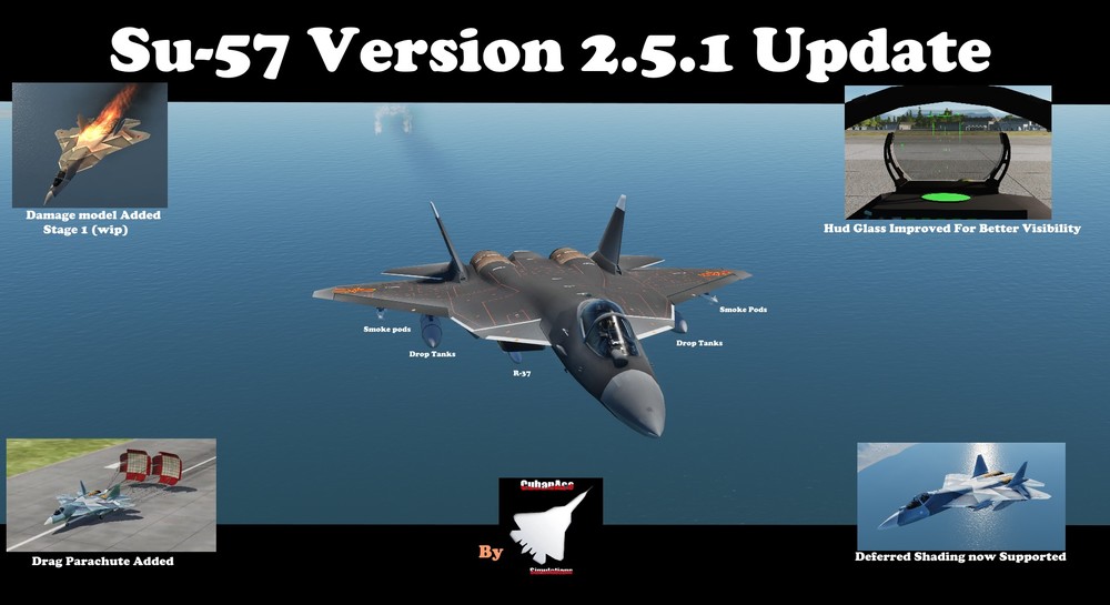 SU-57 2.5.1 update SU-57 2.5.1 UPDATE READY DOWNLOAD BELOW:D https://www.digitalcombatsimulator.com/en/files/2539621/ # 1 Textures Materials/Glass Improved for Deferred Shading. # 3 Canopy Glass Looks Realistic/Upgraded. # 4 Hud Glass Improved for Better Visibility. # 5 New 3d model of Fuel Drop tank # 6 Glass Hud Reflection tuned for night Missions, also Hud color improved for NIght, # 7 Added Drag Parachutes # 8 RVV-BD and Fuel Drop tanks get there own icons. # 9 RVV-BD (R-37 Missile Improved and Renamed to Better Advanced version. # 10 Demo of the New Missile and its name ID. SU-57 Update 2.5.1 https://www.digitalcombatsimulator.com/en/files/2539621/?sphrase_id=11040043