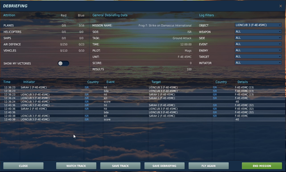 Has anyone else encountered this issue with mission 5 in the Frog-7 campaign? (Strike on Damascus International) Both times that I have tried to complete Mission 5 of this campaign, SARAH 1 crashes due to a midair collision with another one of the AI flights. In this last try, LIONCUB 3 crashed into both SARAH 1 and SARAH 2, causing this message to appear: "SARAH 1 has been lost in action. Abort and change to waypoint 15 for RTB instructions." I'm wondering if it could be due to the AI not being able to handle being in such close formation or something else. Screenshot of the mission result and a .rar file with the track file attached. I'm going to try turning off wake turbulence in my game settings and instructing the AI flights to go into a "trail" formation during the low altitude section to see if that helps. Here is a video of the collision on YouTube. (Latest attempt done in DCS 2.9.19.13478.) Side Note: For QOL update, I think the coastal waypoint should be set to a VIP point over the bridge, so Jester can get a nav fix. frog7m5.rar