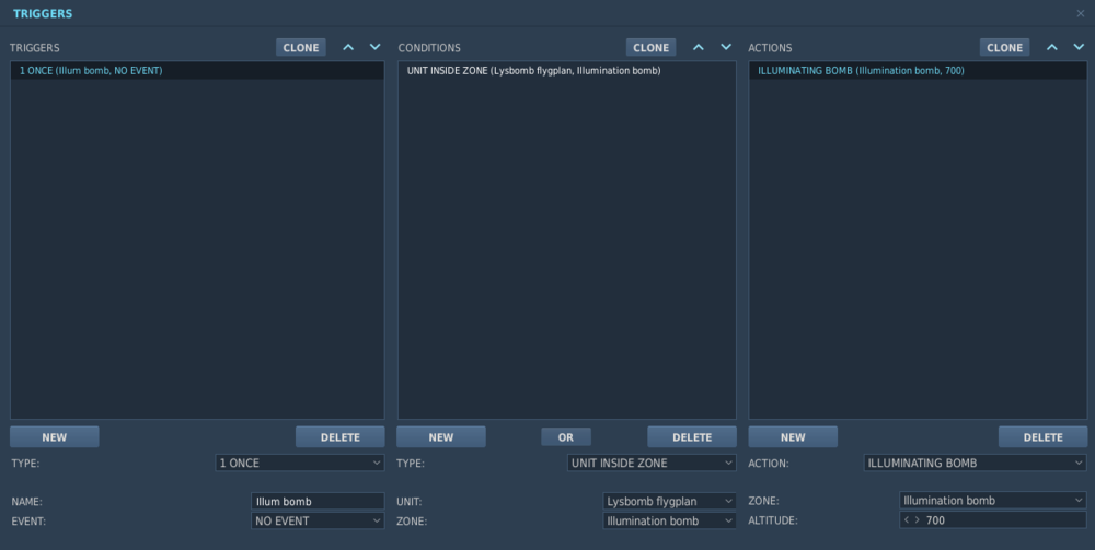 It's not the aircraft itself that is going to drop something this way. The game will simply just spawn in an illumination bomb when the selected aircraft enters a trigger zone. It's a "cheat", but it works. You can of course make it more advanced than above, this is just the bare minimum needed.