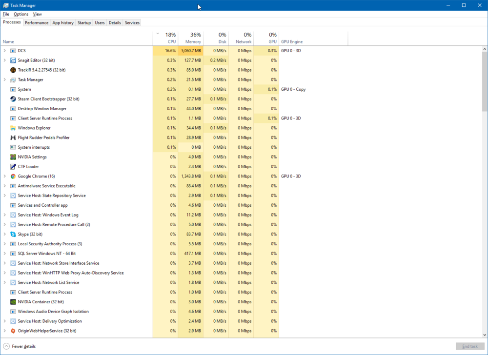 Hi All, Recently I experience that the game (I play only A-10C in Caucasus and Nevada) got frozen. I can't decide whether it is a bug at my side or the game is buggy. Please find below the logs and setup I have. In the morning I got a quiet big update - 10G, but it did not help. The game gets frozen as before. Screenshots are attached about the setup I play the game. The task manager screenshot shows the processes after the game got frozen. The GPU process shows that the game and the GPU are disconnected (I don't have better expression for this, I'm not a game programmer - sorry :) ) because the GPU is not working anymore. In the log file (bottom of this post) there is no any suspicious message. Is there any info you need to figure out what is happening here? Elite Dangerous runs like a charm on this machine. === Log opened UTC 2018-03-15 09:46:15 2018-03-15 09:46:15.328 INFO VFS: Using 'Saved Games': "C:\Users\SayusiAndo\Saved Games" 2018-03-15 09:46:15.464 INFO DCS: DCS/2.5.0.15085 (x86_64; Windows NT 10.0.16299) 2018-03-15 09:46:15.464 INFO DCS: DCS revision: 135081 2018-03-15 09:46:15.464 INFO DCS: Renderer revision: 15903 2018-03-15 09:46:15.464 INFO DCS: Terrain revision: 16060 2018-03-15 09:46:15.464 INFO DCS: CPU cores: 4, threads: 8, System RAM: 32703 MB 2018-03-15 09:46:15.476 INFO EDCORE: (dDispatcher)enterToState_:0 2018-03-15 09:46:15.480 INFO Dispatcher: 2018/3/15 10:46 V1704040900 2018-03-15 09:46:15.489 INFO INPUT: Device [Keyboard] created deviceId = 1 2018-03-15 09:46:15.648 INFO INPUT: Device [saitek Pro Flight Rudder Pedals {7786CC00-A6AB-11e6-8001-444553540000}] created deviceId = 2 2018-03-15 09:46:15.648 INFO INPUT: Joystick created[saitek Pro Flight Rudder Pedals {7786CC00-A6AB-11e6-8001-444553540000}], ForceFeedBack: no 2018-03-15 09:46:15.657 INFO INPUT: Device [Mouse] created deviceId = 3 2018-03-15 09:46:15.662 INFO INPUT: Device [TrackIR] created deviceId = 4 2018-03-15 09:46:15.752 INFO SOUND: loaded 1261 sdefs from "sounds\sdef" 2018-03-15 09:46:15.773 INFO SOUND: Using driver: xaudio29 2018-03-15 09:46:15.793 INFO SOUND: XAudio2: channel layout: FrontLeft FrontRight FrontCenter LowFrequency BackLeft BackRight SideLeft SideRight 2018-03-15 09:46:15.803 INFO SOUND: Found 2 available audio device(s): 2018-03-15 09:46:15.803 INFO SOUND: 0: ID: "\\?\SWD#MMDEVAPI#{0.0.0.00000000}.{8607ef4d-8637-44e0-9a21-1ad24f5e811f}#{e6327cad-dcec-4949-ae8a-991e976a79d2}", Name: "Speakers (Sennheiser Main Audio)" 2018-03-15 09:46:15.803 INFO SOUND: 1: ID: "\\?\SWD#MMDEVAPI#{0.0.0.00000000}.{cdb3f716-ffb9-4d24-bf4b-1e39f52fbb44}#{e6327cad-dcec-4949-ae8a-991e976a79d2}", Name: "Headset Earphone (Sennheiser Communication Audio)" 2018-03-15 09:46:15.803 INFO SOUND: Using SSE FTZ/DAZ mode. 2018-03-15 09:46:16.179 INFO NET: Login success. 2018-03-15 09:46:16.826 WARNING LOG: 1 duplicate message(s) skipped. 2018-03-15 09:46:16.826 INFO DCS: Successfully got authorization data. 2018-03-15 09:46:18.014 INFO Scripting: OBSOLETE mount_vfs_sound_path() used in ./CoreMods/aircraft/AJS37/entry.lua 2018-03-15 09:46:18.067 INFO Scripting: PLUGINS START------------------------------------------------- 2018-03-15 09:46:18.074 INFO SOUND: loaded 15 sdefs from ".\coremods\aircraft\av8bna\sounds\sdef" 2018-03-15 09:46:18.082 INFO SOUND: loaded 9 sdefs from ".\coremods\aircraft\c-101\sounds\sdef" 2018-03-15 09:46:18.086 INFO SOUND: loaded 12 sdefs from ".\coremods\aircraft\chinaassetpack\sounds\sdef" 2018-03-15 09:46:18.097 INFO SOUND: loaded 19 sdefs from ".\coremods\aircraft\m-2000c\sounds\sdef" 2018-03-15 09:46:18.100 INFO SOUND: loaded 10 sdefs from ".\coremods\aircraft\mig-21bis\sounds\sdef" 2018-03-15 09:46:18.109 INFO SOUND: loaded 8 sdefs from ".\coremods\aircraft\sa342\sounds\sdef" 2018-03-15 09:46:18.129 INFO Scripting: PLUGINS DONE-------------------------------------------------- 2018-03-15 09:46:18.288 INFO Database: OBSOLETE mount_vfs_sound_path() used in ./CoreMods/aircraft/AJS37/entry.lua 2018-03-15 09:46:18.345 INFO Database: PLUGINS START------------------------------------------------- 2018-03-15 09:46:18.361 INFO Database: PLUGINS DONE-------------------------------------------------- 2018-03-15 09:46:18.366 INFO SECURITYCONTROL: Loaded ./CoreMods/aircraft/AV8BNA\bin\AV8B_AI.dll 2018-03-15 09:46:18.516 INFO SECURITYCONTROL: Loaded ./Mods/aircraft/A-10C\bin\A10.dll 2018-03-15 09:46:18.550 INFO SECURITYCONTROL: Loaded ./Mods/aircraft/A-10C\bin\Cockpit_A10Common.dll 2018-03-15 09:46:18.646 INFO SECURITYCONTROL: Loaded ./Mods/aircraft/A-10C\bin\Cockpit_A10C.dll 2018-03-15 09:46:18.839 INFO SECURITYCONTROL: Loaded ./Mods/aircraft/F-15C\bin\F15CCWS.dll 2018-03-15 09:46:18.891 INFO SECURITYCONTROL: Loaded ./Mods/aircraft/F-15C\bin\F15.dll 2018-03-15 09:46:18.895 INFO SECURITYCONTROL: Loaded ./Mods/aircraft/P-51D\bin\P51Base.dll 2018-03-15 09:46:19.059 INFO SECURITYCONTROL: Loaded ./Mods/aircraft/P-51D\bin\P51B.dll 2018-03-15 09:46:19.086 INFO SECURITYCONTROL: Loaded ./Mods/aircraft/P-51D\bin\Cockpit_P51Common.dll 2018-03-15 09:46:19.099 INFO SECURITYCONTROL: Loaded ./Mods/aircraft/P-51D\bin\Cockpit_P51D.dll 2018-03-15 09:46:19.100 INFO SECURITYCONTROL: Loaded ./Mods/aircraft/TF-51D\bin\P51Base.dll 2018-03-15 09:46:19.101 INFO SECURITYCONTROL: Loaded ./Mods/aircraft/TF-51D\bin\TF51D.dll 2018-03-15 09:46:19.105 INFO SECURITYCONTROL: Loaded ./Mods/aircraft/TF-51D\bin\Cockpit_P51Common.dll 2018-03-15 09:46:19.110 INFO SECURITYCONTROL: Loaded ./Mods/aircraft/jsAvionics\bin\jsAvionics.dll 2018-03-15 09:46:19.110 ERROR WorldPlugIns: Failed to read serial number for 'A10C-BFT_campaign' 2018-03-15 09:46:19.147 INFO DX11BACKEND: Driver Concurrent Creates - 1 2018-03-15 09:46:19.147 INFO DX11BACKEND: Driver Command Lists - 1 2018-03-15 09:46:19.148 INFO DX11BACKEND: NVIDIA API init OK 2018-03-15 09:46:19.149 INFO DX11BACKEND: NVIDIA Display Driver Version 38569.r384_00 2018-03-15 09:46:19.149 INFO DX11BACKEND: TRUNK renderer init: showShaderError coreCount=1 2018-03-15 09:46:19.300 INFO DX11BACKEN