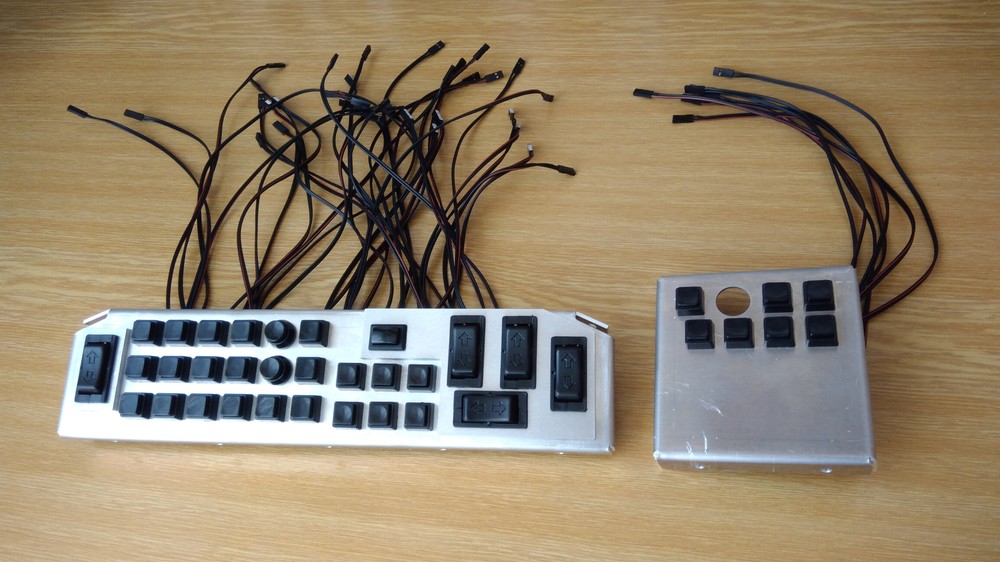 About a year ago I bought Thrustmaster MFD Cougar pack. It is great device, only stability of the frames is not quite perfect with the standard base. So I decided to replace this base with some holder that would better secure the position of both frames, then I started to think about possible additional functions of this new holder ... Finally it was added in my modest home cockpit what you can see in the photos below. Description: 2 x TM MFD frames (the base and the back side removed) 32 x pushbuttons 5 x rocker switches (ON momentary - OFF permanent - ON momentary) 5 x 3-position switches 6 x 2-position switches buttons and switches position based on UFC, AHCP and NAV panels in A10-C cockpit aluminium sheetmetal box MJOY16 and USB hub inside