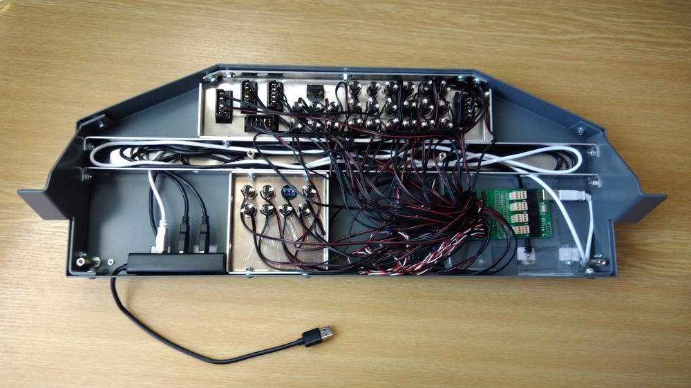 Connecting the buttons and switches to MJOY was easy. I'm afraid that installing monitors into the panel would be too hard for me. :) As far as MJOY16 is concerned, I know only this manual ... http://www.joysticks.ru/download/files/MJoy16-C1_Users_Manual_v1.pdf