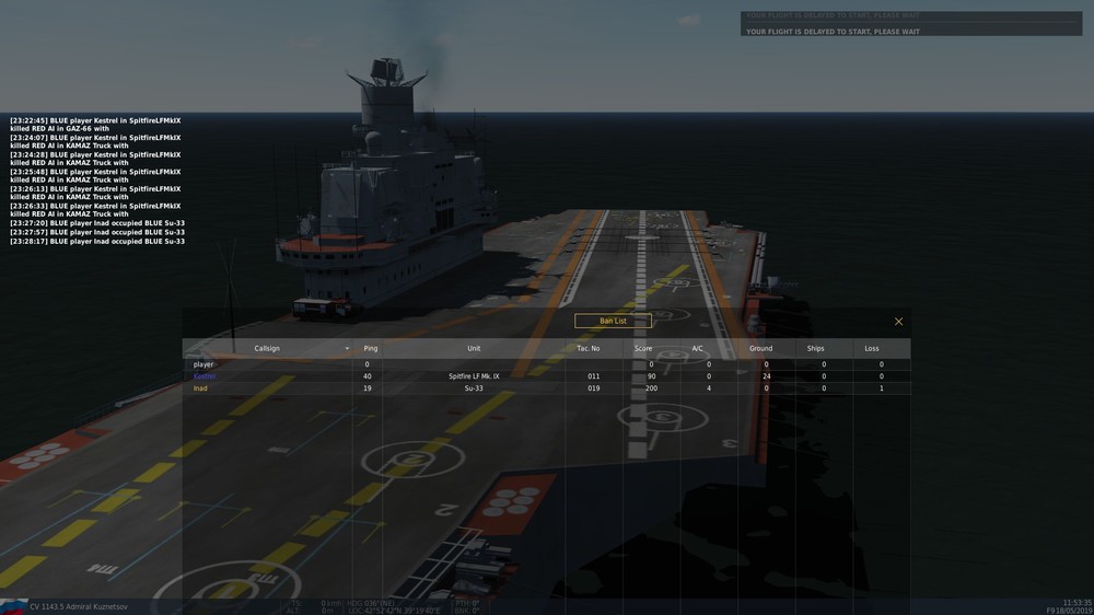 Kuznetsov spawn logic is weak now. The screenshot case: no other Su-33 in the server free Kuznetsov start positions 3 different slot choosed and no one can spawn! EDIT: Go to spectator then back is our workaround long ago. Figured out after a long time. Please not scare newbies! When the scene is empty let us to spawn please! EDIT: real world MP track 3x unsuccesful spawn: https://drive.google.com/open?id=1GHSyICi8GT5jaynLNExISPBrPguta8tc ( BATTLEFIELD-20190710-181516-yfidtspWaitx3slotKuznetsov.trk) -
