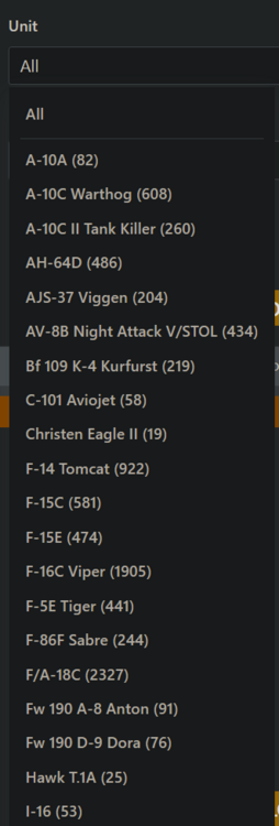 EDIT: Fixed, user files now have F-4, thank you Hello, it seems the user file section of the website is missing the F4 Phantom as a select-able unit when filtering files. This also seems to be the case when uploading a new file. See attached screenshots, nothing related to the Phantom found under "F", not elsewhere in the list either.