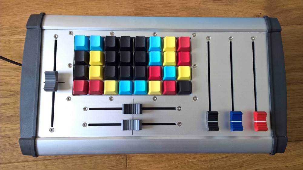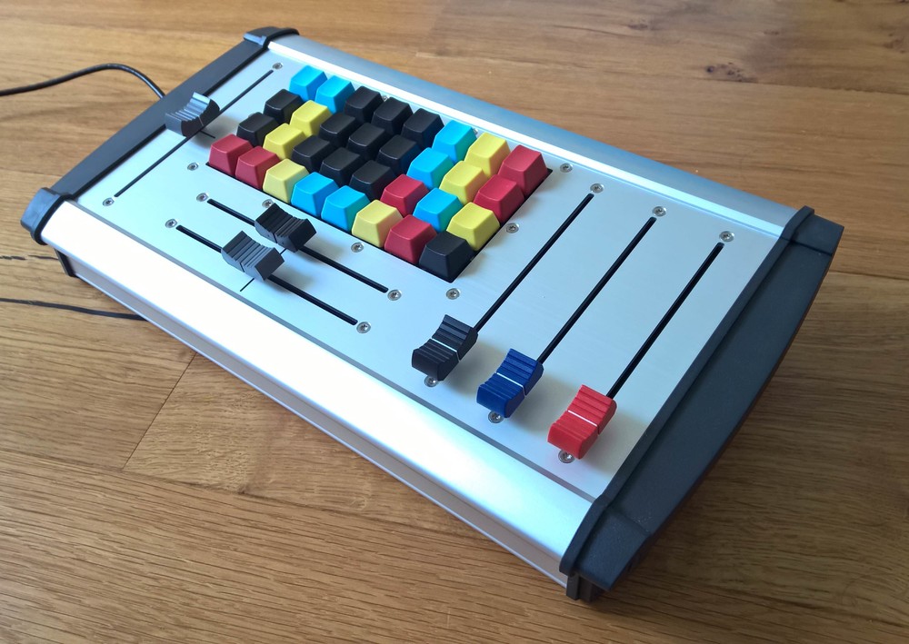 It consists of 6 ALPS studio faders and 32 Cherry MX (brown) mechanic keyboard switches. The left fader is controlling the elevator, the two underneath the buttons are for rudder and ailerons. To the right are three controls for throttle, prop, mixture (or for thrust with up to three individual jet engines, two thrust and one speedbrake etc.).