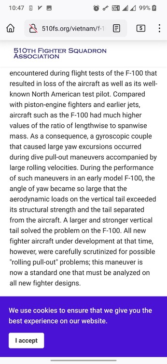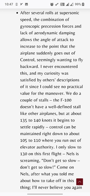 Inertia coupling goes along the inertia axis with smaller radius, thus making it spin super violently. F-100s inertia couple problem mostly happens at high speed and high attitude. Not takeoff and landing. its has nothing to do with it. Starting a rapid roll movement along with the "inertia axes" and "aerodynamic axes". the roll produces a rapid change in AOA. When the roll velocity surpasses the critical level. Aerodynamic forces can no longer hold it. It tends to roll along other axis. Another is torque-induced gyroscopic precession, only occurs when the aircraft pitches (lateral axis) or yaws (vertical axis) not roll, motion against the inertia axes. which causes the nose to slightly pitch diagonally. the swept wing is more sensitive to the angle of attack and angle of slip. Adverse yaw might be the dominant force tilting the aircraft in that accident. However, oscillating the nose will oscillate the Δβ can only deteriorate the situation. Btw , if you oscillate the nose up and DOWN in DCS ED modules. it rocks the nose diagonally, which raises my suspicion. But who knows, maybe their jet PFM API also share the same math with their warbirds.. -