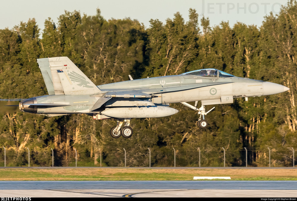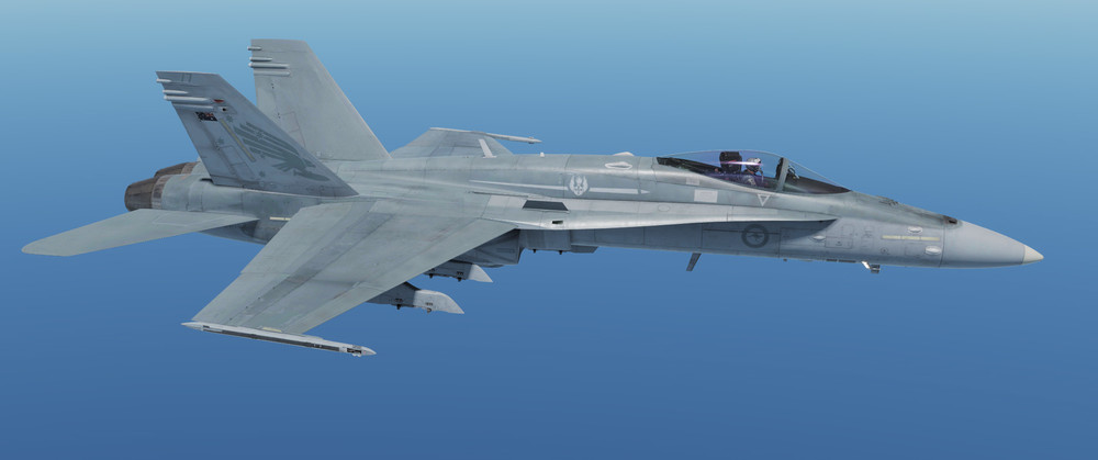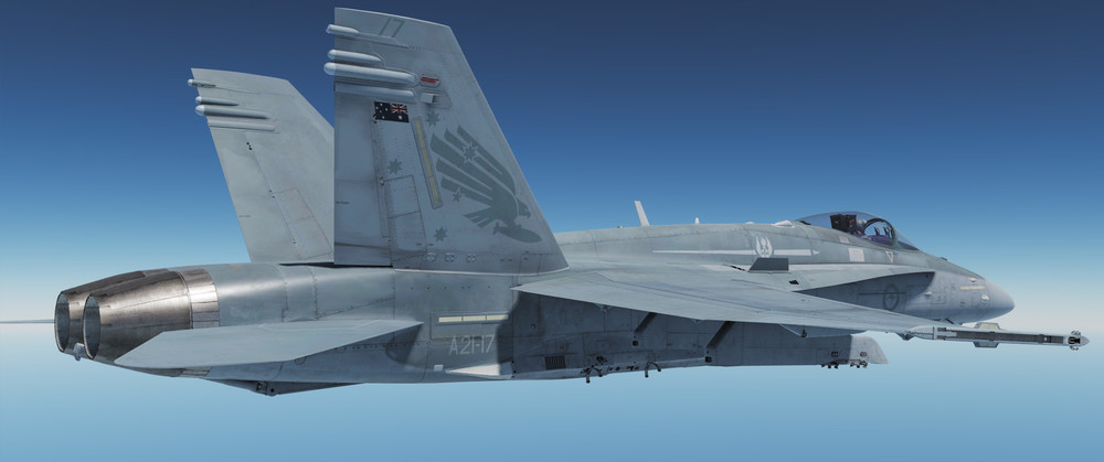 Introducing F/A-18 Hornet RAAF Pack 2.0 - 3SQN A21-17 https://www.digitalcombatsimulator.com/en/files/3301625/ A21-17 appears as it did in June 2017. This low visibility scheme is indicative of any 2010’s 3 Sqn Hornet, and represents the final year of the Hornet in 3 Sqn service, before the remaining aircraft were transferred to 77 Sqn to make way for the F-35A. The tail displays the 3 Sqn eagle carrying a bomb logo, with the Southern Cross backdrop, modernised from the mid 2000’s to have a more defined appearance. The fuselage arrows are inverted in colour, with the 3 Sqn eagle crest as the centre-point. Many of the panels have been repainted and show varying amounts of paint fade. There are minimal fluid deposits on the wings and tail. The most notable element is the anti-slip surface on the leading edge extensions, which is inverted from its usual black or faded gray appearance.