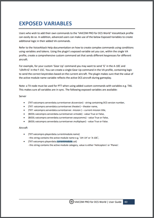 Hi , I just updated to DCS OB to v2.7.7.15038, VAICOMPRO v2.5.26.0 and VA v1.8.9 and it looks like not all "exposed variables" work anymore. Flying around in Caucasus in the FA-18C (free flight solo mission) I can get {TXT:vaicompro.serverdata.currentserver.theater} to work (returns Caucasus as expected) but both {TXT:vaicompro.playerdata.currentmodule.cat} and {TXT:vaicompro.playerdata.currentmodule.name} return "Not set". In the attached picture we can see the module is detected and display in the VAICOMPRO configuration window, SRS also recognizes the module and switches to the correct profile. It's a bummer because I use different button presses for my radios depending on the plane I'm flying. Any clues ? So far I tried the following: -Running VA, VAICOMPRO, SRS, DCS as admin -Repairing SRS & VAICOMPRO -Searching for "vaicompro.playerdata.currentmodule" in the forums -Verifying the command didn't change in the VAICOMPRO manual Cheers, Here is the VoiceAttack configuration. I expect it to output the currentmodule name and category along with the theater, but I only the theater seems to be working. Here is the relevant page in the user manual.