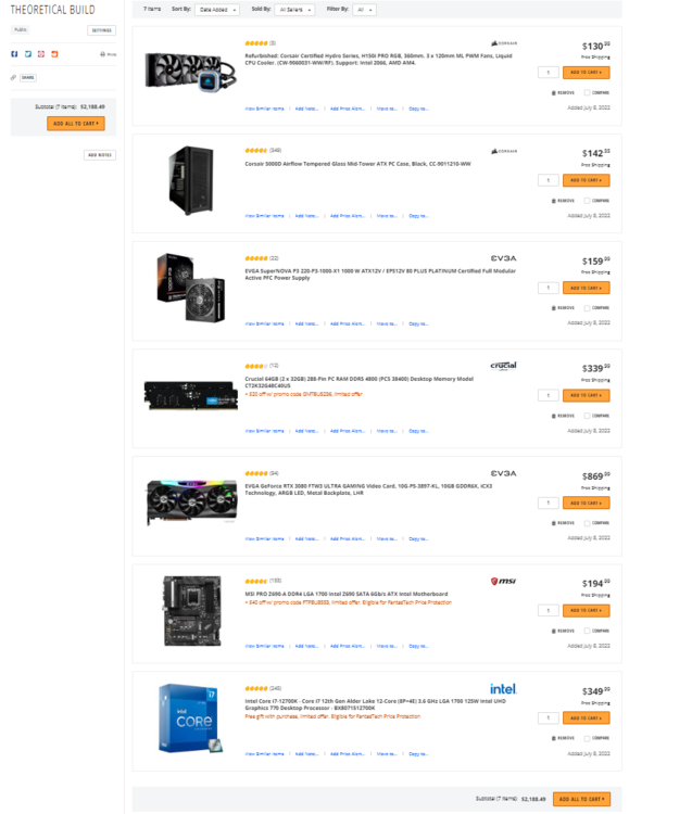 I just put together a wishlist with a similar build @ newegg and got 64GB of ddr5 4800 and a 1000w PSU and my total is $2,057 before any tax or shipping. I did not add a keyboard or a mouse, but frankly my $60-$70 logitech options have been the best purchase I've ever made. They run on batteries and they last quite awhile. No more plugging things in. Knowing that, it's up to you to decide if the convenience of a prebuilt system is worth that much more money, with less ram. The $700 saved on a system with more ram could get you a 3090 when you consider the cost of the 3080, and the PSU to run everything overclocked or a VR headset or something to that extent. If you can get behind installing the hardware yourself and setting up your BIOS and installing windows and all your drivers on your own. I could further reduce costs of my theoretical build if I wanted to. I would probably be griping and complaining the whole time I was putting it together and figuring out cable management though. I'm sure it would be a fine rig either way. *oops.. i forgot cooling.. new screenshot incoming, found a refurb h150I for $130. New price is $2,188. Closing the gap but still a considerable chunk of change while offering more ram of which the worth is subjective and personal opinion, and still not being terribly more expensive than your prebuilt if you were to swap the 3080 for a 3090. I want to suggest that maybe there's somebody who'd put it together out there if you pay him $100 or something and you'd still be saving money, but, I'm in a valley. Not on a mountain. Cry once buy once might be the way to go. For me building is like putting together a lego set. My friend with his pre-built, it was either that or I build it for him and I sometimes forget my familiarity could be considered the exception. Other food for thought - didn't see a motherboard model number on the prebuilt. It's not hard to close the gap if you start fishing for higher end components. if one wants to, there are $300 keyboards and mice out there. I gave up the flashy lights myself and have found the best bang for my buck in a logitech G613 + G603.