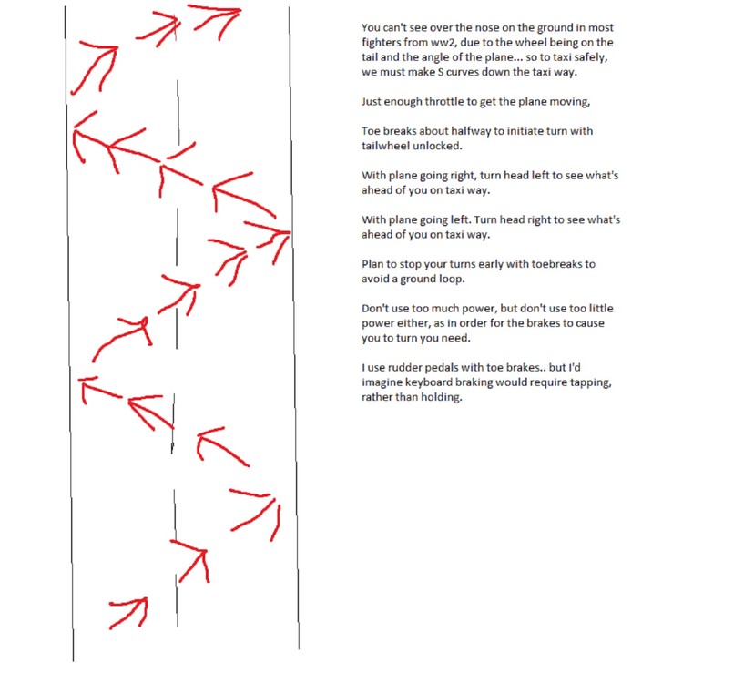 Today I was on a ww2 dogfight server taxiing off of the runway and considering a place to park without stopping in someone's spawn point... some other guy starts his engine, throttles up and plows straight ahead into me. Says "I couldn't see you" and proceeds to call my taxiing crazy. I'm not going to name names.. but I do hope he reads this. You're right.. you couldn't see me. But that's not my fault, as ww2 aircraft mostly being taildraggers offer perfect visibility from the side when on the ground. Taildraggers do not have the benefit of taxiing in a straight line due to the lack of forward visibility. So, with a little work from the toebrakes you can avoid ever running into someone again. Instead, we go from side to side down the taxi way, looking left if the plane is going right, and looking right as the plane goes left. Doing so you can always see what's ahead of you on the taxi way. Even pulling out of your parking spot, you should probably turn a bit to view what's ahead of you... that way, people like coming off of a runway after a landing and know how to taxi in a way that we can clearly see you, don't have to worry about you throttling up into me and attempting to blame it on me when I'm turning left on to the taxi way, suddenly throttling up in fear hoping to get out of the way of you blindly plowing forward in to the nether. With an unlocked tail wheel you can even learn to turn in extremely tight spaces without hitting walls or moving far from where you started. I'm no expert by any means.. I might even flub a take off.. but..I can at least try to explain how to taxi properly. My experience led me to MS Paint.. so there's always something to point that guy who can't see what's ahead of him to. I made a typo in my picture. You'll see it.. "You need forward momentum" Here's a video I just made attempting to demonstrate the concept. I just threw it together without any kind of script or rehearsal so pardon my pauses for thought.