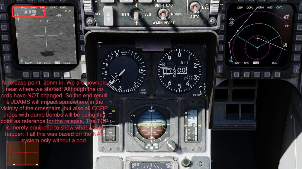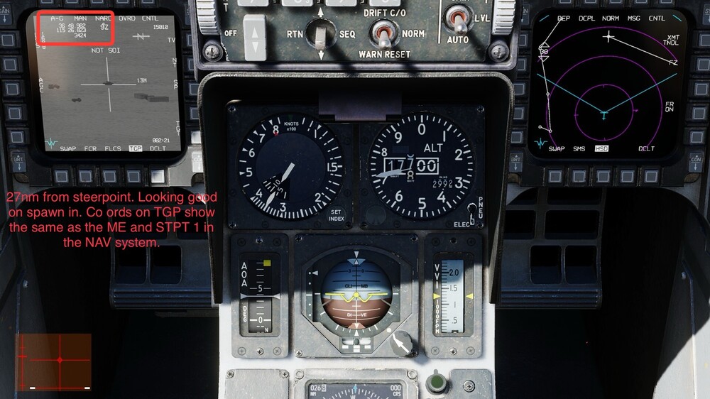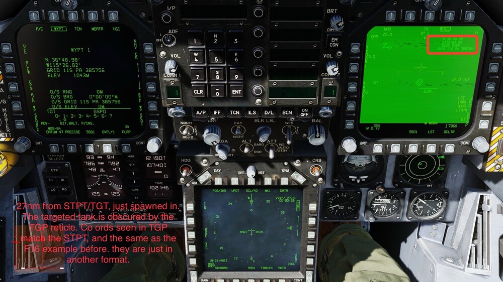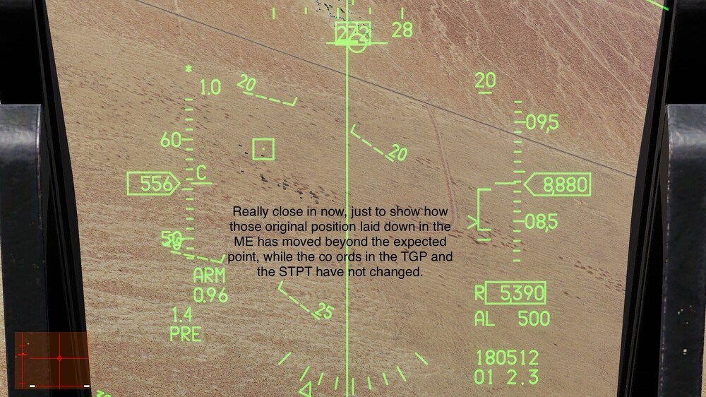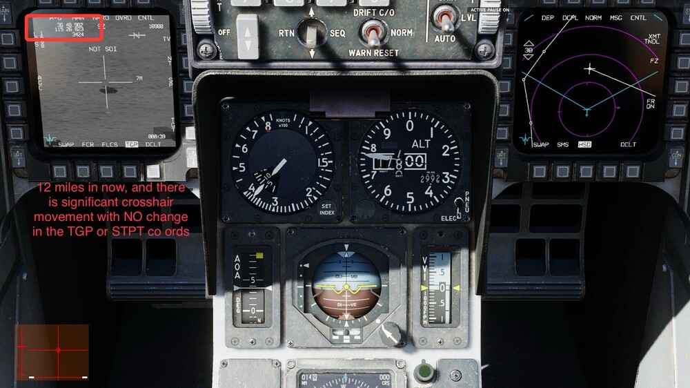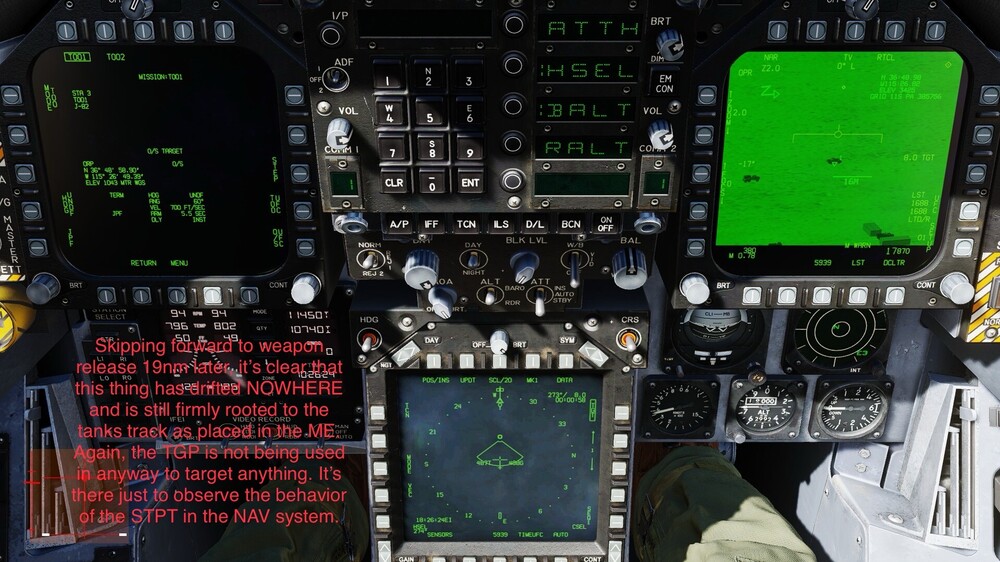 user error CCRP / GPS navigation not working?bladewalker replied to Homer79's topic in Bugs and Problems Understandable…….. BUT………. So the bottom line to all this, is the difference in the way the F16 and the F18 process / handle their steerpoints, and NAV system. Basically the F16’s steerpoint wanders like a stray dog, while the F18’s steerpoint is as solid as a rock. In the coming screenshots, you’ll see what I mean….. I have placed two steerpoints in the ME in the identical position at the base of a tanks tracks, both at ground level altitude. 1 steerpoint is an F16, and the other is a F18. This is an air start test with both aircraft starting 27nm away from the steerpoint. The TGP’s are purely there for reference. The F16’s TGP is defaulted to the current steerpoint, with NO slewing done at all. Likewise with the F18, with the TGP slaved to WPTDSG for steerpoint 1. You’ll see as the F16 gets closer to the steerpoint, the point gets further away from the initial point defined in the ME. If you reference the lat long in the TGP window, you will notice that the numbers do not deviate at all, but the crosshairs and by association, the steerpoint on the ground change quite considerably from the position defined in the ME, and this is over a mere 27nm / 4mins or so. If this is to be signed off as the new modeling of the GPS/INS system and the inherent errors associated with it, then why is the F18’s system bang on the “Atom”? What is the difference between the RL systems that make the f18 so superior? An aircraft that is of similar age to the F16?