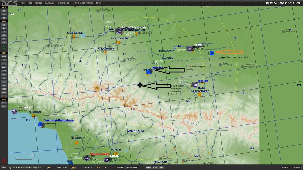 ok thank you, got the AWACS in the air and i'll do the waypoints soon, but first issue is when I fly up I can't use the "\" then "F7" to call the AWACS and get a Bogey Dope. Any ideas why? Also, is it possible to reduce the range of the SAM's? I want to limit them to say 10 nms as per the picture so that become base defence only when someone is within firing range only. Updated Multiplayer fun map.miz