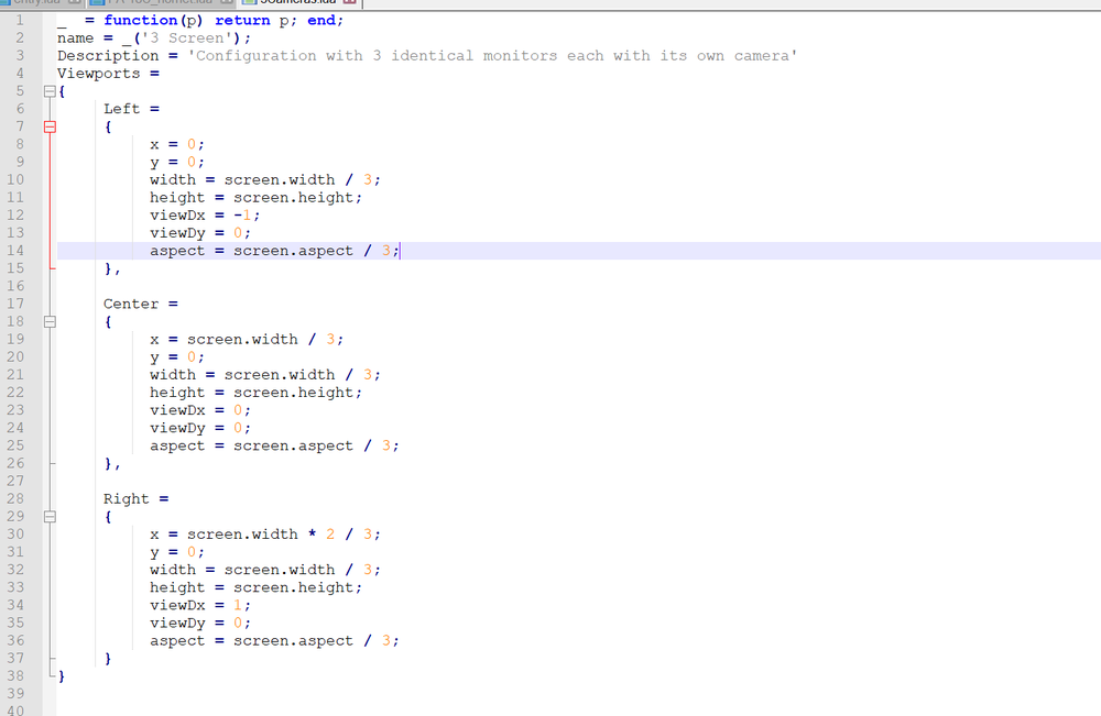 I've managed to get the triple monitor setup working (mostly), but I can't get the left and right monitors to move on the horizontal plane. With the default viewDx setting, the left and right monitor view "tilts" downward. If I change the ViewDx setting to anything other than the 1/-1 in the .lua file (editing with notepad++) the left and right monitors only display what is in the center monitor. Setup: Nvidia 2070 Max card, 3x ASUS 4k monitors on display ports. I tried the default 1 monitor setup with the correct resolution (11580x2160) but I get the shader error and the world comes to an end. A little help?