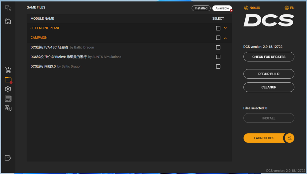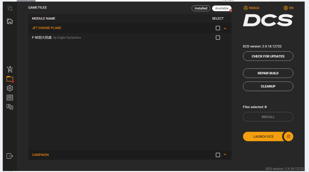 After the latest update to 2.9.18.12722, the Launches shows modules that I did not purchase as being available for download, with module info in Chinese (i think). Have done full clean & repair, logged out and in to account, reboot PC, etc but still present. Game appears to work correctly, unless I download the modules/campaigns in question, then DCS forces me to stand-alone 24 hr mode. Fixed by deleting the module and campaigns in question. .Note that I have not purchased the module (F-5E FC?) or campaigns in question.