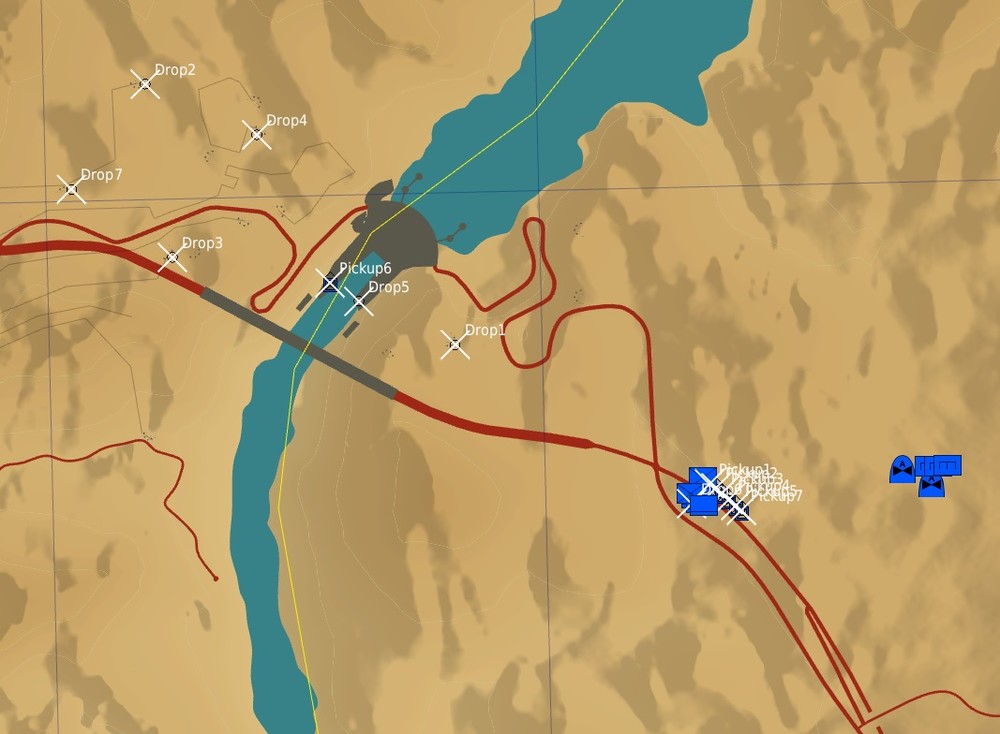 The fourth drop is at the bottom of the dam. The terrain mesh (?) is a little off down there. You can either get in the right spot and use manual release or if you use auto-release, land in the smoke and the cargo will release when you are about 4 feet off the ground. The cargo for the fifth pickup looks like it is floating a couple feet off the ground. Things are a little off down there. HooverSlingloaders.miz