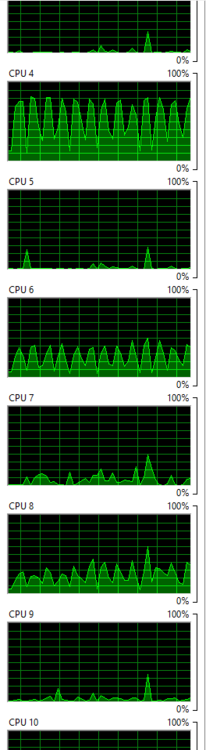Hello everyone, I have updated to the latest 2.5.6 stable on Friday, and I must say that it performs better overall than the old 2.5.5. When playing on the F-18 Case I mission on SC today, though, I started noticing that, close to the carrier, I was getting heavy stutters every 4-5 seconds, about 5 minutes into the mission. Thinking it was a bug/poor optimization in SC, I decided to leave it be for the meanwhile, and set up a quick 2 vs 2 BFM mission in Nevada from cold and dark. Here as well, 5-10 minutes in, I start getting these awful stutters, with no specific events happening (usually still starting up or taxiing). And here is what I see on the Task Manager: With cores acting up like this: I know what you are about to say: throttling. Funny thing is, both ThrottleStop and Intel XTU say that no throttling happened, and temperatures were around 75°C. Still, the frequency of the CPU loading and unloading make me think something, somewhere, is throttling my system. Now, about my computer: it’s definitely not a gaming one. MacBook Pro 15” 2018, i9 2.3 boostable to 4.8 GHz, AMD Vega 20 with 4 GB, 32GB RAM, running BootCamp on an SSD, thermal pad mod (helps reduce temperatures further), cooling pad. But the system could handle constant 60 FPS (capped) on 2.5.5, and it can even on 2.5.6, before this “throttling” occurs. Things I have tried: Pagefile at 32GB on SSD, disabled Turbo Boost, disabled HyperThreading, set affinity on physical cores only (and vice versa), antialiasing from video card driver (not DCS), disabled intelppm.sys, disabled track file and hotplug from autoexec.cfg, fans set to max speed, alt+enter, high performance mode on windows, disabled game mode, made sure CPU Min and Max is at 100% under power settings. I can’t understand if it’s a problem with DCS or my setup specifically, but considering that I can run for several minutes @60 FPS, with no CPU capping, and constant temperature, it makes me think about a DCS leak somewhere. Any suggestions? Thanks. Daniel
