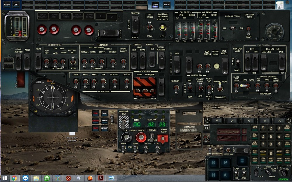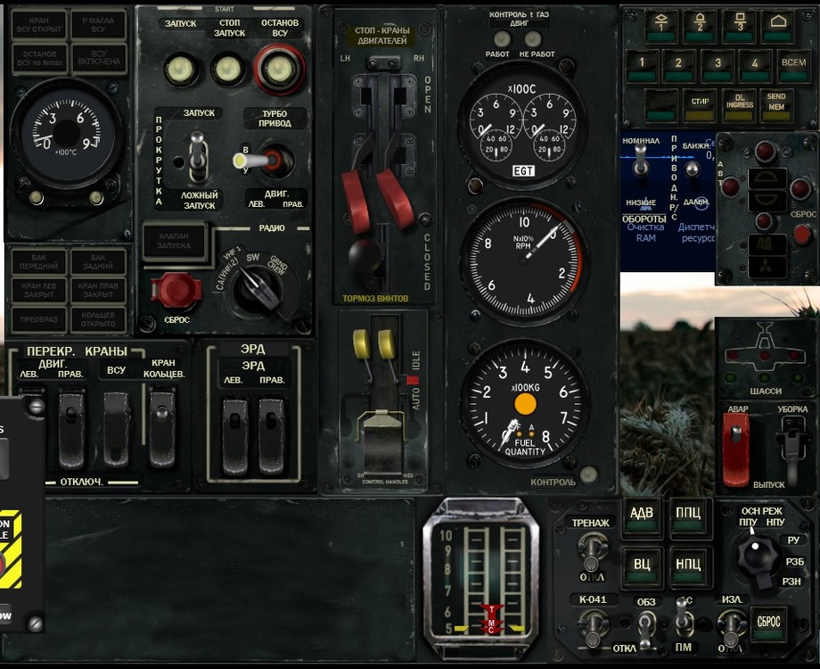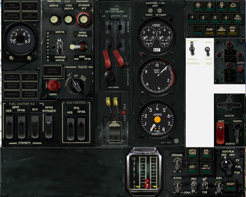 А если обрисовывать проблемки, то примерно так: 1. Перевод сигнального табло на те, что правильно. То есть, не Левый Двигатель Превышение Скорости, а так как в оригинале. LH ENG OVERSPD RH ENG OVERSPD ENR COURSE HUD NOT RDY WEAP. ARM FIRE (казалось бы - пожар, но фиг его знает) UNDER FIRE CANNON CANNON <> OVER G COMP DIAG HMS FAIL COMP FAIL MAIN HYD SYS VLV TURBO GEAR STD HYD SYS VLV 2. Все нерусифицированные кнопочки. Именно кнопочки-батоны. 3. Пока не придумал, как подменить циферблаты приборов на правильные-русские. Там не так всё просто, как сначала казалось. С остальным вроде бы разобрался. Ну... мне так кажется на первый взгляд... :)