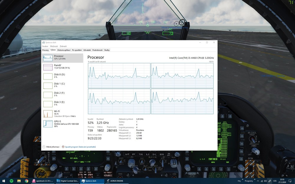 Hello everybody! I'd like to ask you for help with my DCS performance. I'm running DCS on fairly old PC (i5 4460, 16GB DDR3 RAM, 1060 6GB, SSD), but my FPS are generaly fine on smaller missions. When I however try a mission with a lot of units my FPS unsurprisingly drops rapidly. The problem is that both my CPU (58 %) and GPU (28 %) seem underused (screenshot 1) but my FPS are shit (11). Interestingly when I pause the game my CPU usage drops a bit (52 %) but my GPU usage (88 %) and FPS (71) rise rapidly (screenshot 2). Also I found that lowering graphics in this particular mission Hornet campaign mission 2, does not help with performance, at least on mission start. In your experience, what might be the cause? What is bottlenecking what? Thanks!