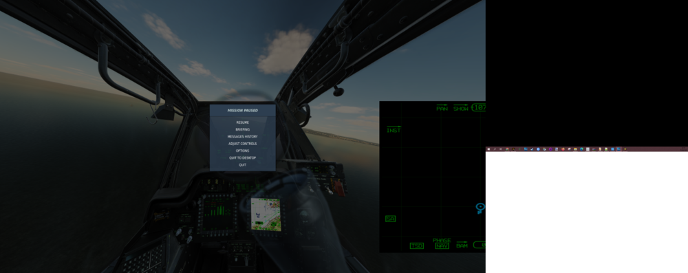 **Douche Bag of the year here didn't extend the screen to INCLUDE the width of the tablet. That's why it was cutting off!!! Now I have another little error in my thinking......... The main window is a little bit squashed (guessing it's taking into account the NEW aspect ratio) - - how do I fix that!!?? FINAL EDIT - promise (only writing in case others are silly like me). Set Aspect to 1.7777 in the config and all was fine. Didn't work when setting in game....... updated lua: Origianal lua: I'm getting the attached image from below. It IS what I was expecting, as I'm not getting anything on the IPAD using Splashscreen so I adjusted things as an eperiment. Do you think that's the issue, and it'll work if I dig out an old monitor? As a proof of concept it's FINE - I can resize the CPG right screen etc, but it's not sharing across to the other screen (you can see I deliberately moved the MFD down and across a bit, to ensure it "covered" the second screen). When I did the printscreen in the first place, I wasn't expecting the other display to show, and it works fine in Windows... Any ideas? TIA EDIT: I HAVE now downloaded the .zip from above and added: AH64_CPG_RIGHT_MFCD = to the script, but still the same....