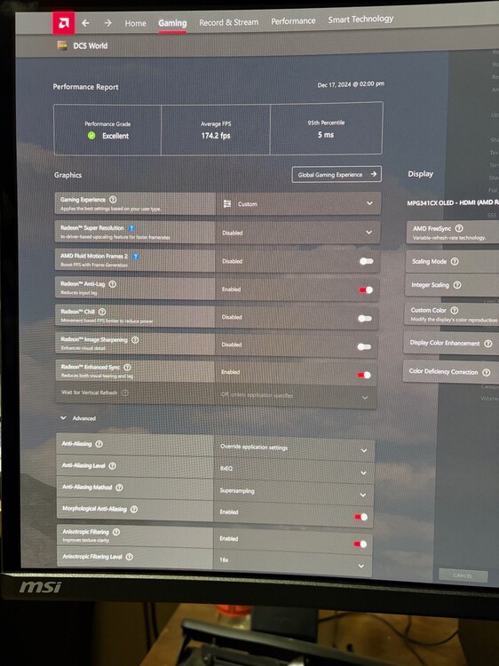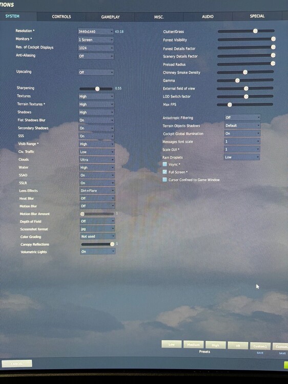 Hello all, i can ether make the world look awesome or the jets. not both. I realize this game leans towards Nvidia but that's not what i have. AMD Ryzen 9 5950X 32 Ram AMD Radean RX 7900xt Now everything in high or better and over 100 FPS and smooth as silk { looks pretty good as well just i know i can get it better} DSLL and such make things better but the jets have a blurry look and lose their shape without everything the the distance gets the sparkly jagged strobe . Any ideas what setting to fiddle with as I've been in circles for too long