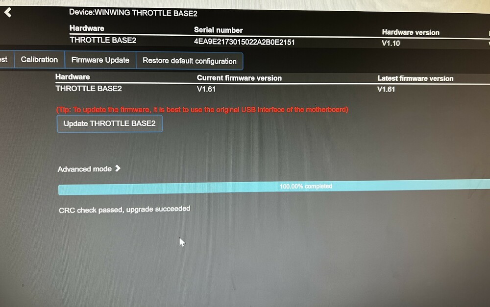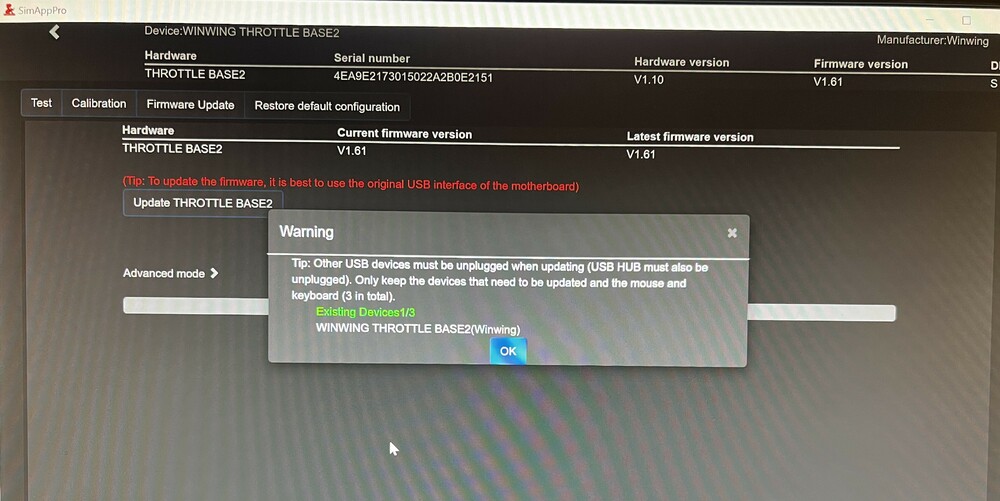 I used the throttle for over a year without any problems. And today I ran SimAppPro(after over a year), which showed me that a throttle update was available. So I clicked to make it. The update went well - at the end it showed SUCCESS, and then the system started making a sound as if I was disconnecting and connecting the device to USB. And so on and on... Now only the A/G and A/A keys are flashing green and the system does not see the throttle (it doesn't even see it in Windows>Print and Device as a BOOT device). I tried connecting it to every USB port and it didn't change anything. I sent an email to: info@winwing.cn with a description of the problem, but maybe some of you have already had a similar problem and know how to solve it. IMG_4285.MOV