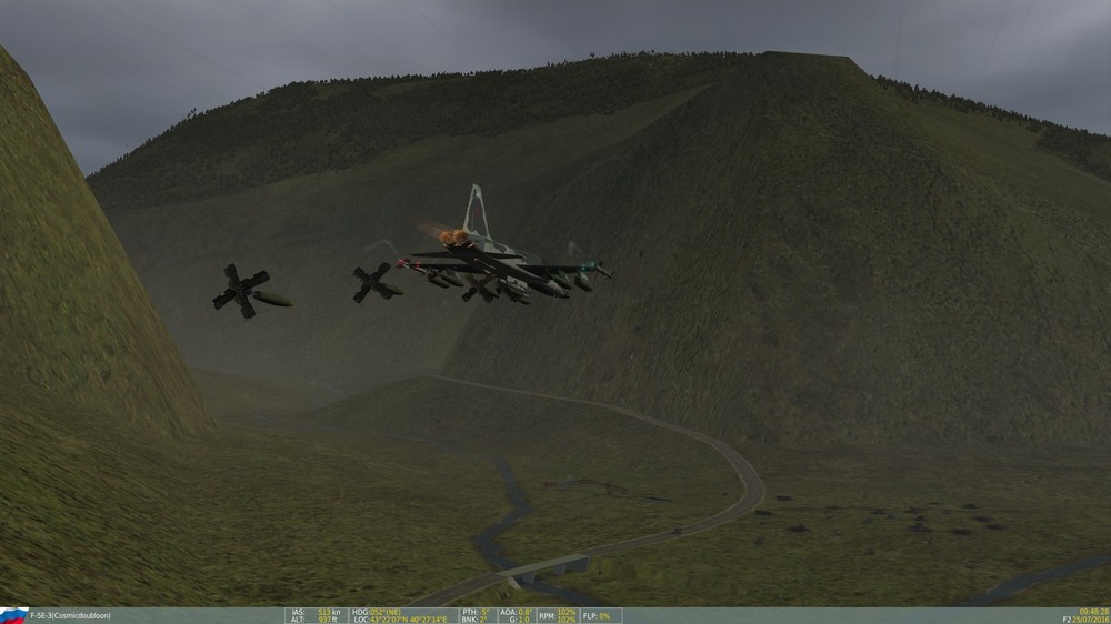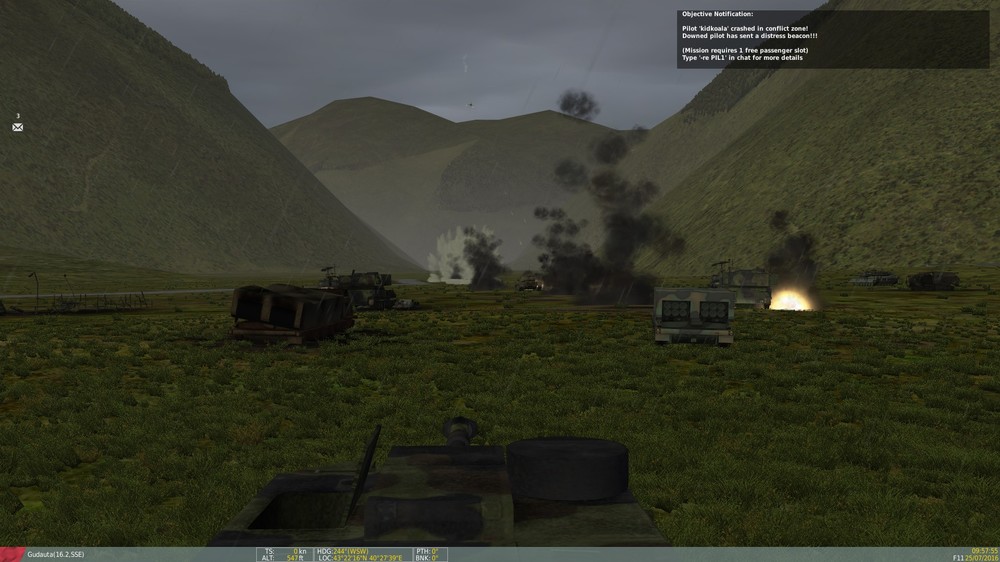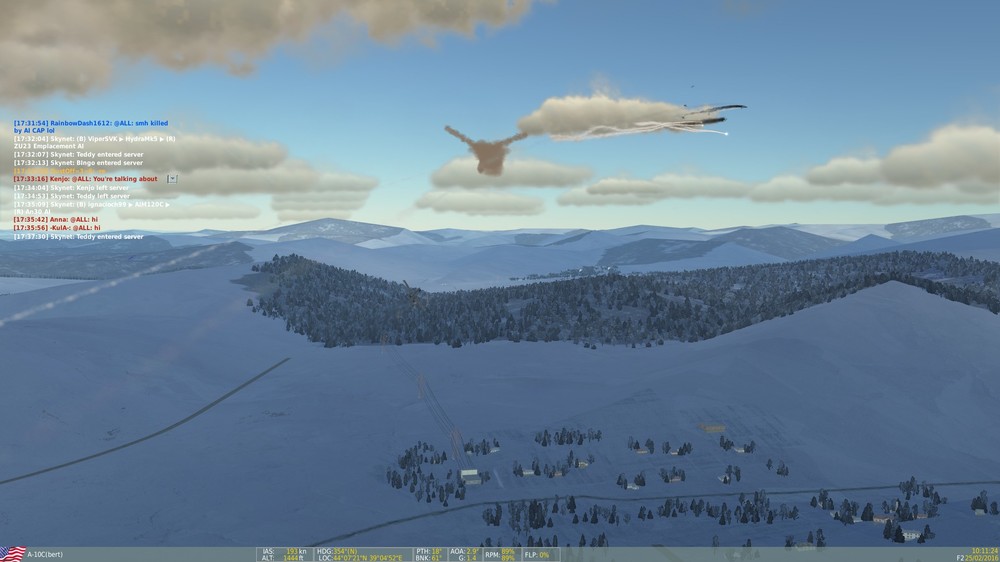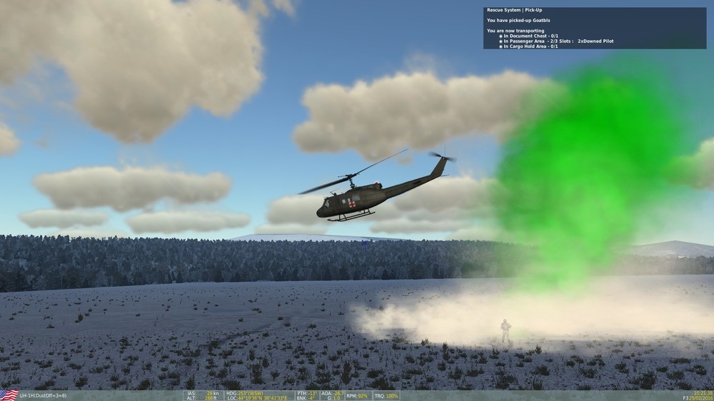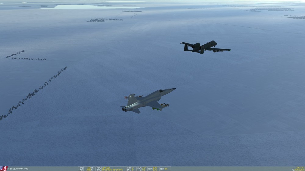 17. -Short story, Open Conflict Tuapse- The radio crackeld to life, " we have a friendly F5 that just landed near a friendly sam base that is currently in contact with enemy aircraft and under enemy artillery fire!' The only CAS aircraft we have on station is a single A10C! Scramble, scramble, scramble! The sound of the Lycoming turbine engine began to whine as it struggled to start in the subzero temperature but eventually the thump of the slick Huey single rotor blade began to echo across the frozen valley. ETA 18 minutes. We have an A10 on station providing CAS. Moments later, Voodoo1 voodo1 radar contact 15 miles hes doing 500 kts. The A10 immediately switched to a2a mode and began utilizing the awacs instructions to target. Danger close 3 miles...MERGE! A swooping hard left turn the a10 jumped the enemy fighter and the aim9m growl quickly sheered to an ear piercing zing. FOX2! Splash! Over the immense enemy ground fire the the stricken F5 pilot began to hear the legendary sound of rotors, "rescue 1 has eyes on green smoke." The helicopter landed in the soft snow and loaded the pilots. "Archangel this is rescue 1, troops on board and green, coming out." The helicopter spooled to high idle flinging snow and ice in all directions as it lifted off and disappeared into the snow capped mountain tops. Mission Success.